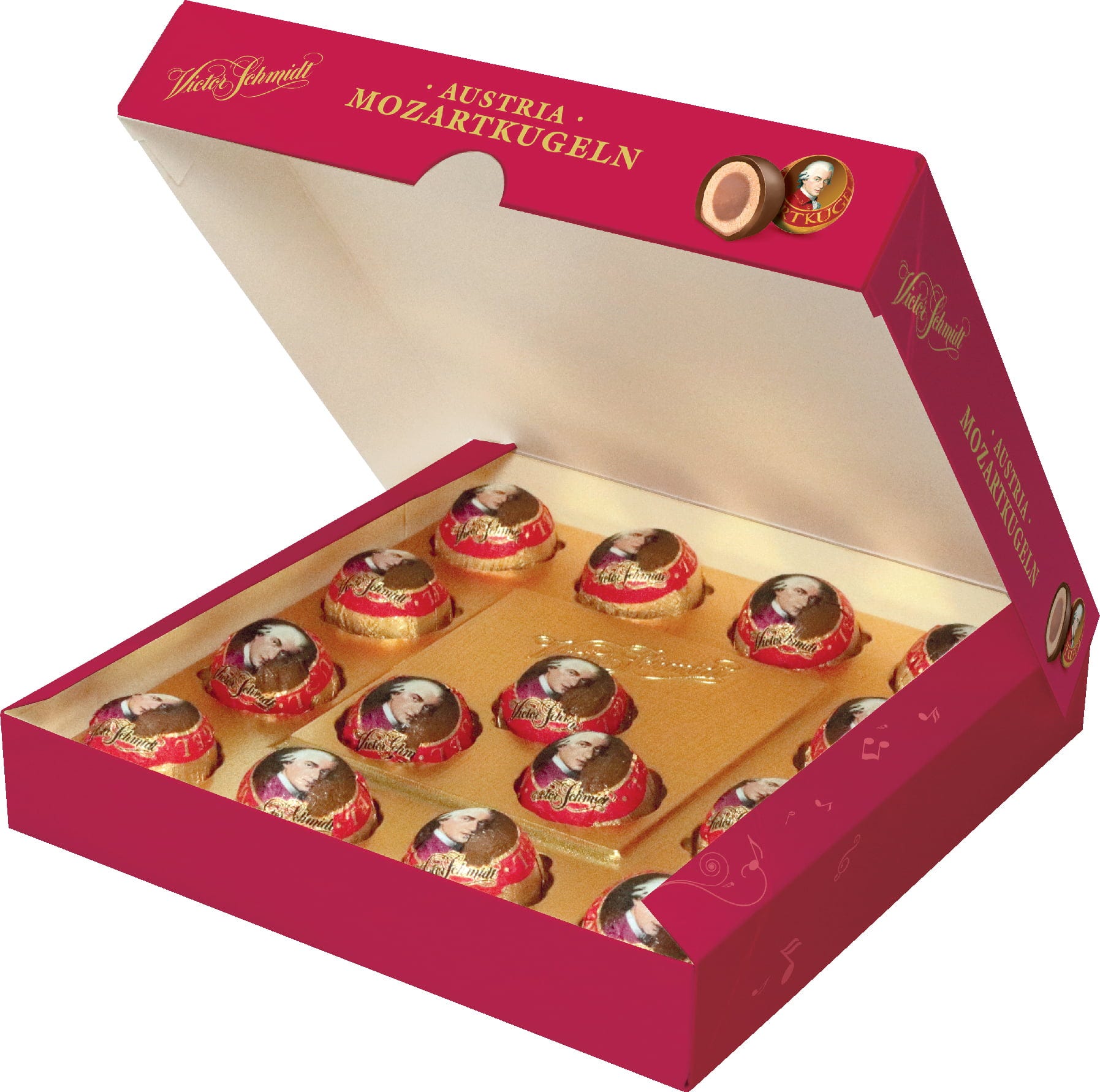 Die österreichische Kreation der AUSTRIA MOZART KUGELN ist aus einem feinen, von einer Schicht Marzipan umhüllten Nougat-Kern und außen aus einer Hülle aus edler dunkler Schokolade. Der Geschmack dieser Pralinen ist so beliebt, dass die MOZART KUGELN nicht nur die österreichische Süßigkeit schlechthin ist, sondern Kulturgut in Schokoladenform. Der erlesene Genuss dieser Schokoladen-Kreation ist dank der Verwendung feinster Zutaten und höchster Sorgfalt bei der Herstellung mit nichts zu vergleichen!