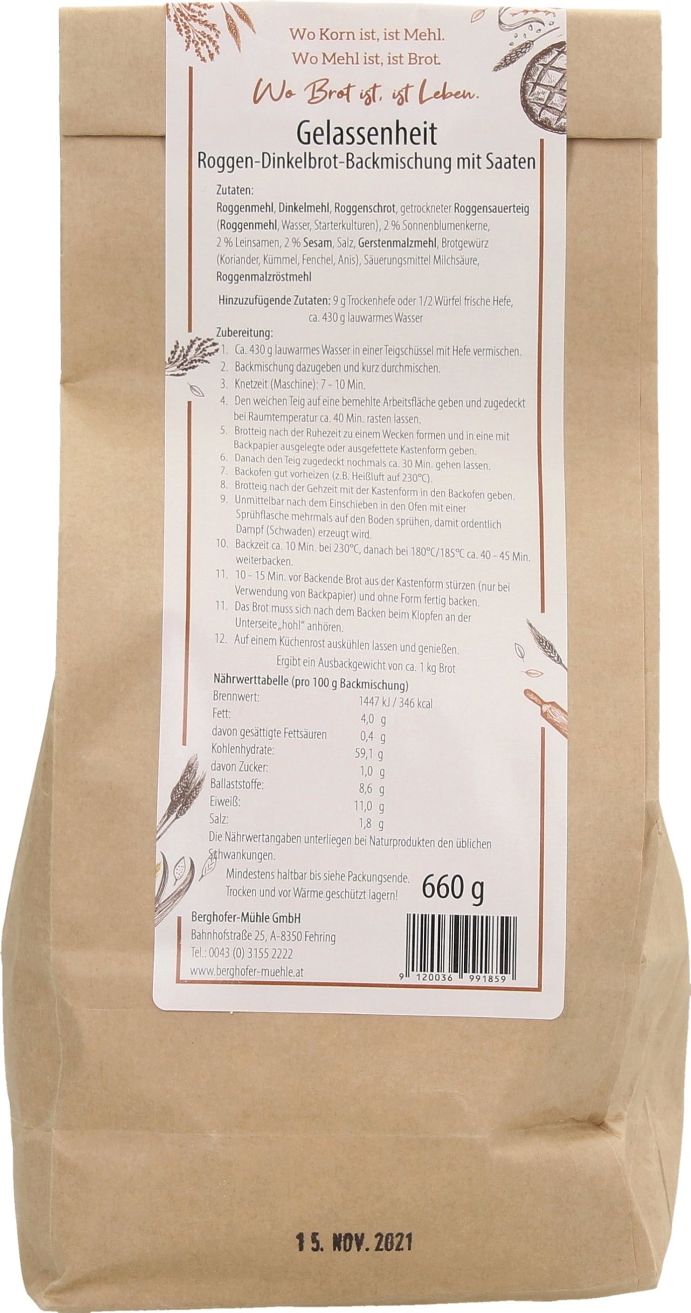 Berghofer Mühle Backmischung Gelassenheit - Rgg-Dinkelbrot m. Saaten, 660 g