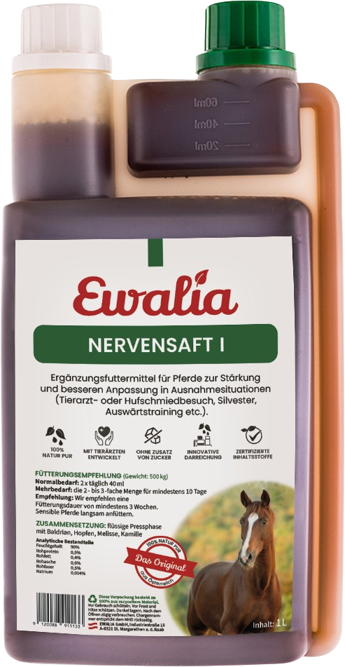 Der NERVENSAFT I von Ewalia kann mit einfacher Dosierung, Baldrian und Hopfen für Ausnahmesituationen mit hervorgerufenem Stress, also an Silvester, dem Auswärtstraining, Umzug, Boxenruhe, Tierarztbesuch etc., eine bessere Anpassung geben. Das Ergänzungsfuttermittel für Pferde kann in solchen Schrecksituationen, sowie bei Angst, Stress und Anspannung unterstützen!