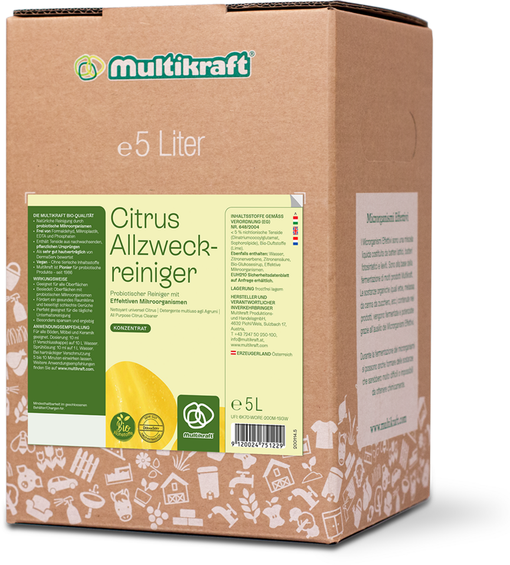 Bei der Anwendung des eMC Allzweckreinigers von Multikraft kommen probiotische Mikroorganismen zum Einsatz, welche Verunreinigungen abbauen, außerdem siedeln sich die Mikroorganismen auf den Oberflächen an und werden bei erneuten Verschmutzungen wieder aktiv. Der Reiniger ist für alle Oberflächen geeignet, er neutralisiert unangenehme Gerüche und sorgt bei regelmäßiger Anwendung für ein gesundes Raumklima. Darüber hinaus ist der Reiniger sehr ergiebig und bietet dir die Möglichkeit, deine Oberflächen auf natürliche Weise von Schmutz und Ablagerungen zu befreien.