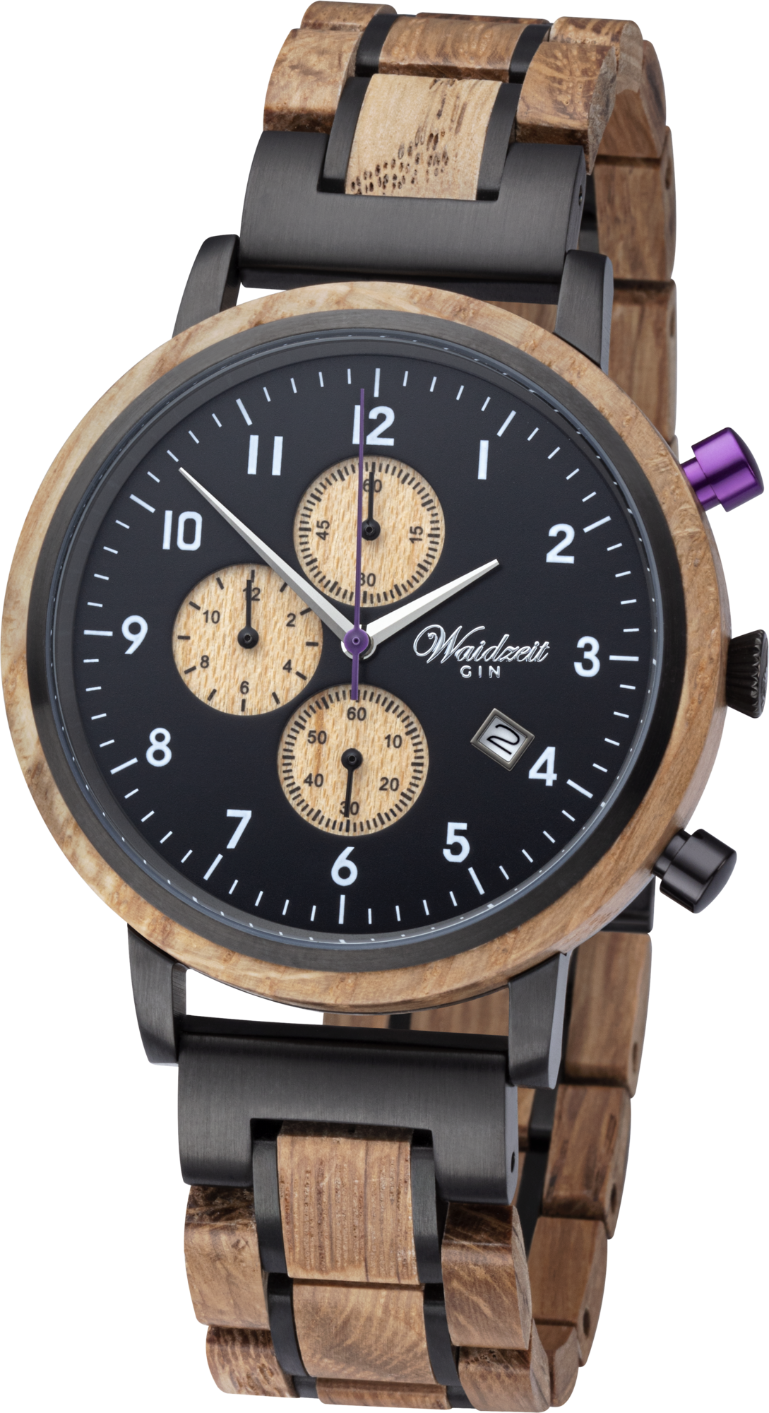 In unseren Regionen hat sich Gin als "IT-Getränk" mit einem unverwechselbaren Aroma längst etabliert und ist aus der Bar-Szene nicht mehr wegzudenken. Aus diesem Grund hat auch Waidzeit Austria den Geschmack des beliebten Wacholdergetränks aufgegriffen. Das Besondere an dem Chronographen namens "Berry" ist die aufwendige Verarbeitung des Wacholderholzes im Ziffernblatt, wodurch er die Seele des Gins in sich trägt. Das Gehäuse und das Armband der Holzuhr sind aus recycelten Barrique Eichenfässern gefertigt und verleihen der Uhr eine einzigartige Optik. Das schwarze Ziffernblatt des Chronographen ist der Wacholderbeere nachempfunden und hat einen Sekundenzeiger sowie eine Krone in der Farbe der Beere. Die Gin Uhr von Waidzeit soll die Zeit für das Besondere betonen und die Werte des Handwerks, der Nachhaltigkeit und des Genusses unterstreichen. Ein Schmuckstück, das nicht nur durch sein Design überzeugt, sondern auch durch seine einzigartigen Materialien und die Liebe zum Detail.