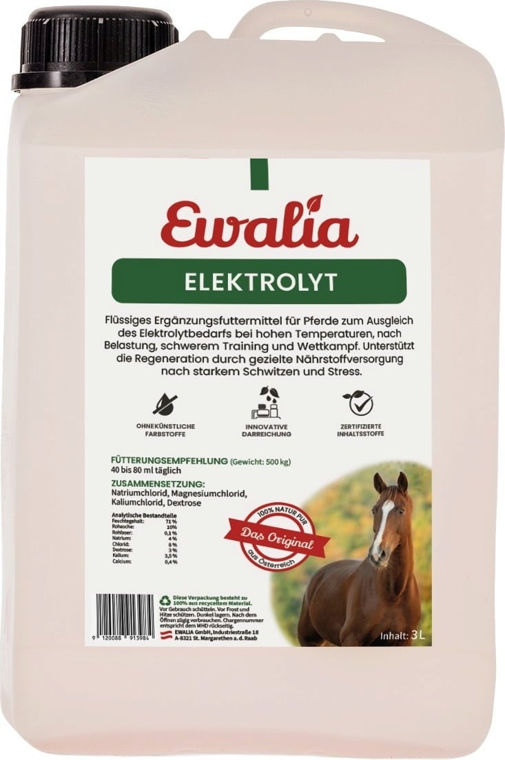 Das flüssige Ergänzungsfuttermittel "ELEKTROLYT" von Ewalia trägt bei erhöhtem Elektrolytbedarf nach hohen Belastungen, schwerem Training, Wettkampf, bei Stress und starkem Schwitzen zur Regulierung des Elektrolytbedarfs bei, und versorgt das Pferd gezielt mit Nährstoffen!