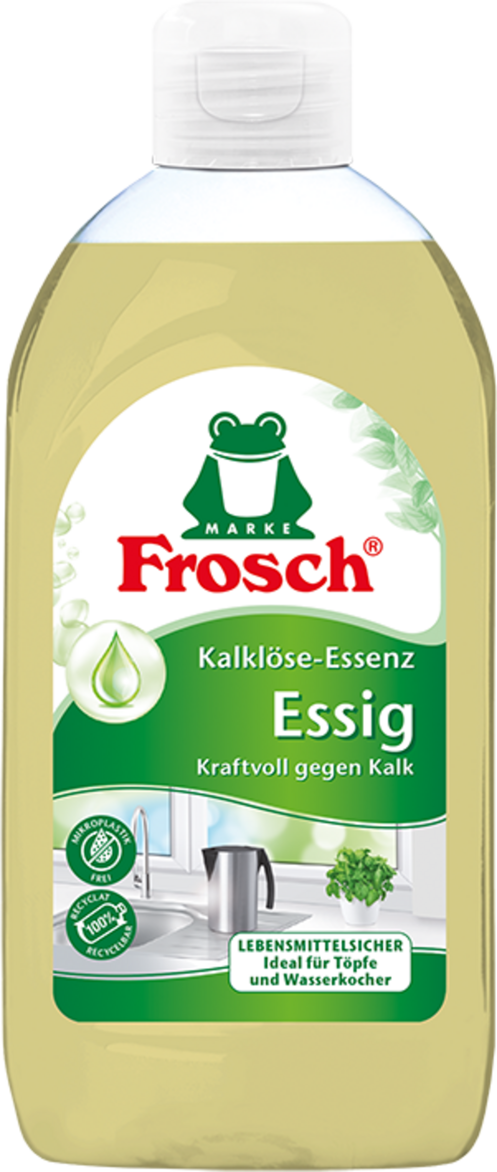 Die hochkonzentrierte Kalklöse-Essenz von Frosch enthält Fruchtessig und sorgt für eine gründliche Entkalkung in Küche und Bad!