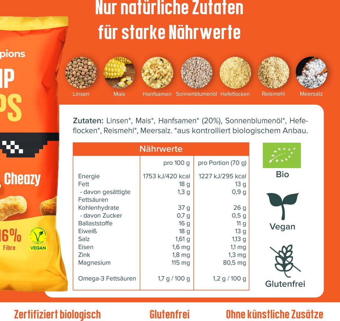 Knuspriger Snack aus 100 % natürlichen Bio-Zutaten. Die Flips aus Linsen, Mais und Hanfsamen sind reich an Protein und Ballaststoffen. Darüber hinaus enthalten sie weniger Fett, als vergleichbare Produkte. Die vegane Käse-Gewürzmischung verleiht den Flips einen besonderen Geschmackskick.