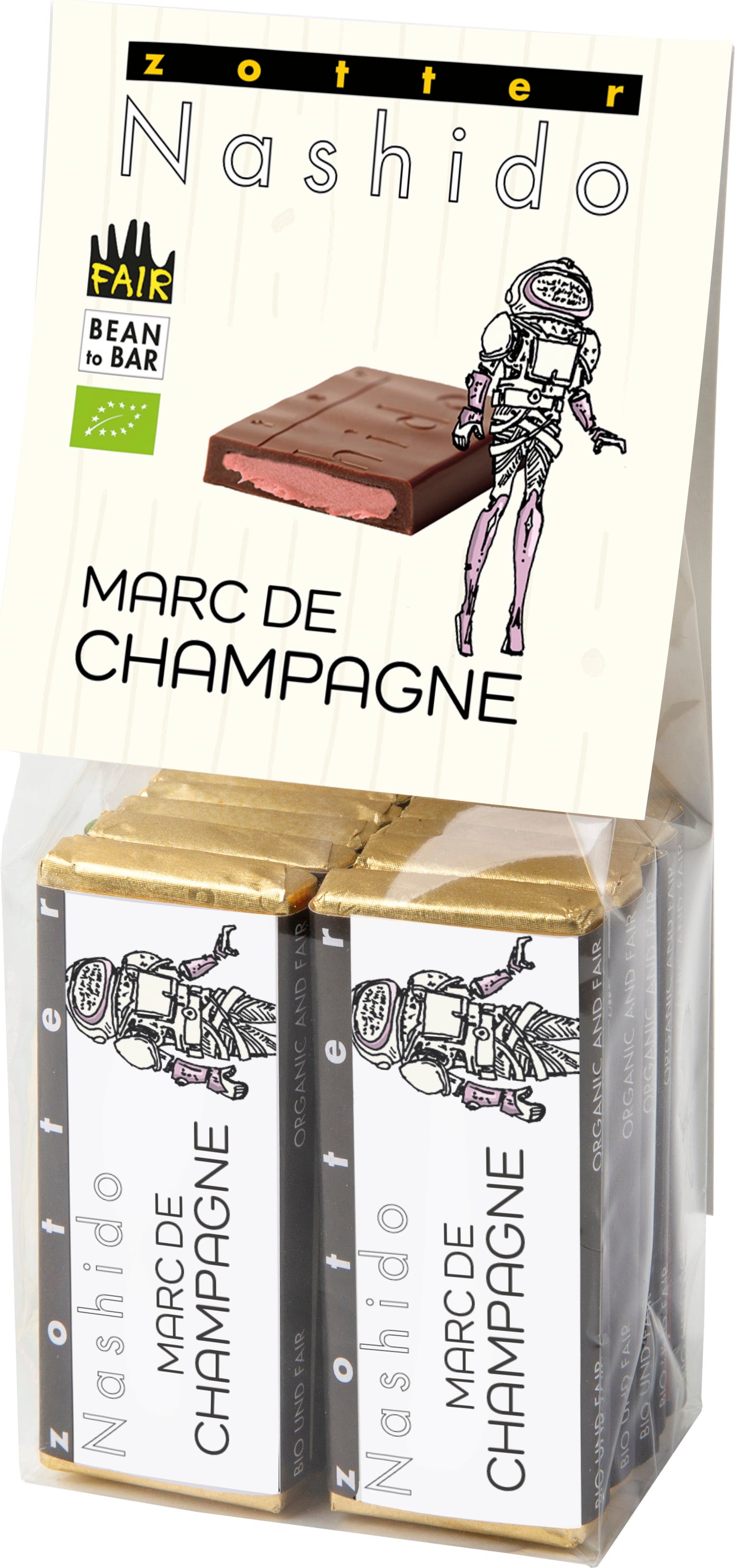 Die 10 bio Nashido-Tafeln "Marc de Champagne" von Zotter Schokoladen sind mit der klassischen Schokoganache aus Milch- und dunkler Schokolade gefüllt, welche mit dem edlen Champagnerdestillat von Fleury, dem ersten demeter-zertifizierten Champagnerhersteller der Welt, veredelt sind. Umhüllt sind die Tafeln mit der feinsten dunklen Schokolade mit 70 % Kakaoanteil!