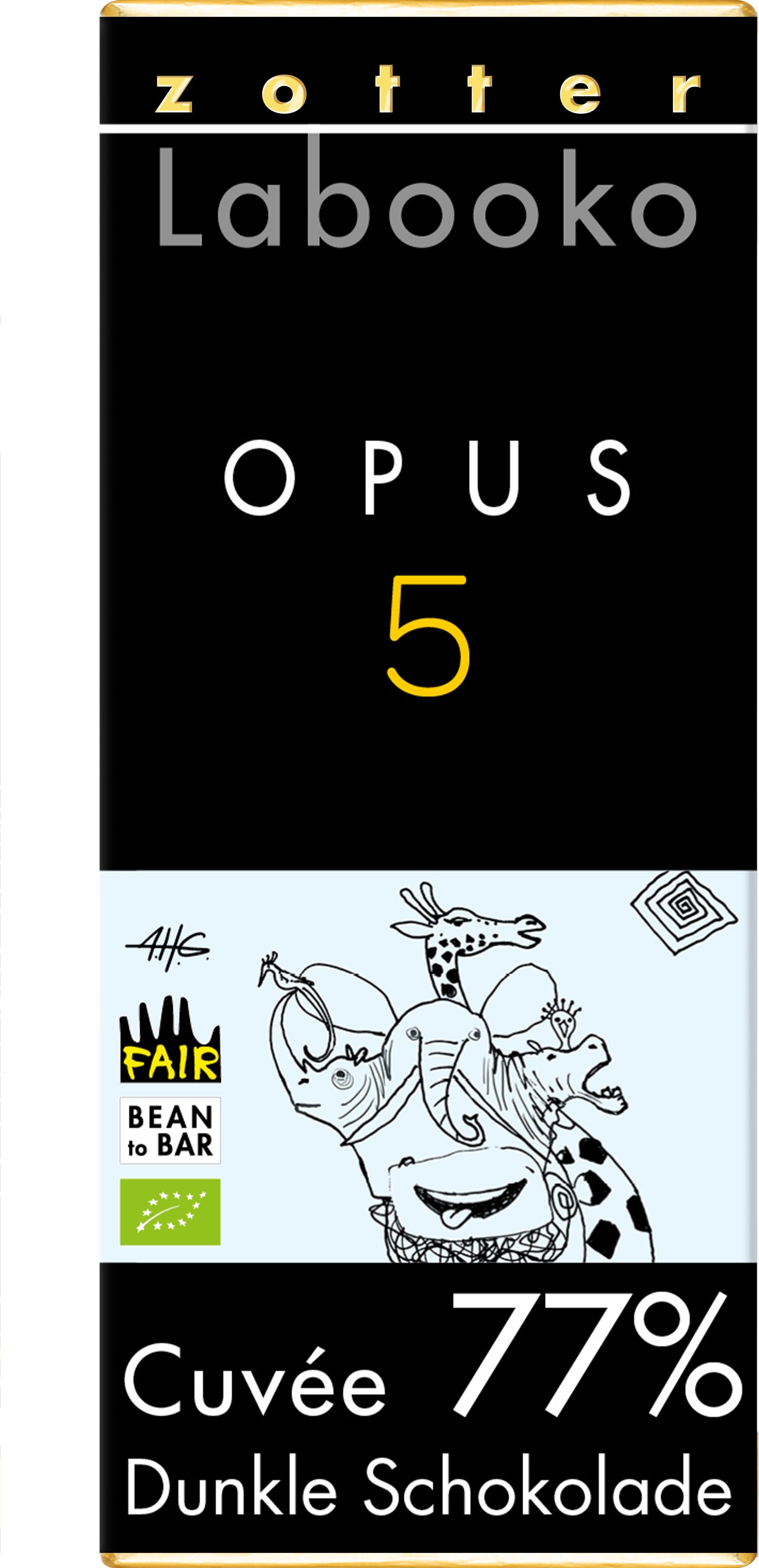 Die Schokolade Opus 5 mit 77 % Kakao ist ein einzigartiges Spitzencuvée aus Kakaoraritäten, die in ungewöhnlichen Höhenlagen wachsen – normalerweise ist Kakao im Tiefland zu Hause. Hier vereinen sich Bohnen aus den Hochlandregionen von fünf Ländern: Ecuador, Kolumbien, Guatemala, Peru und Uganda.