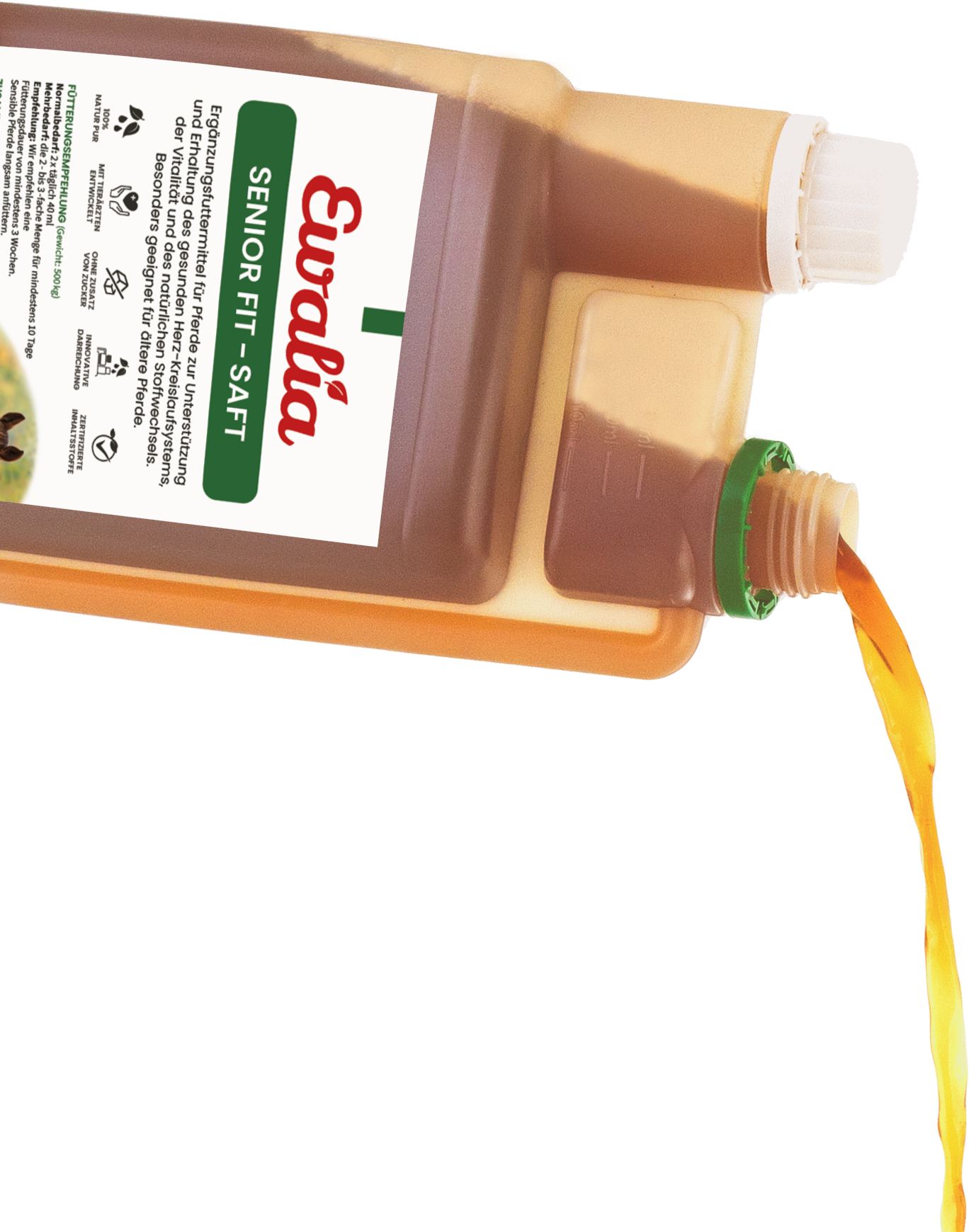 Der SENIOR FIT - SAFT ohne Zuckerzusatz von Ewalia unterstützt mit den pflanzlichen Auszügen speziell bei älteren Pferden gesunde Körperfunktionen, wie die Funktion des Herz-Kreislaufsystems, des Stoffwechsels sowie des Immunsystems. Das Ergänzungsfuttermittel für Pferde ist einfach zu dosieren, und speziell auf die besonderen ernährungsphysiologischen Bedürfnisse älterer Tiere abgestimmt!
