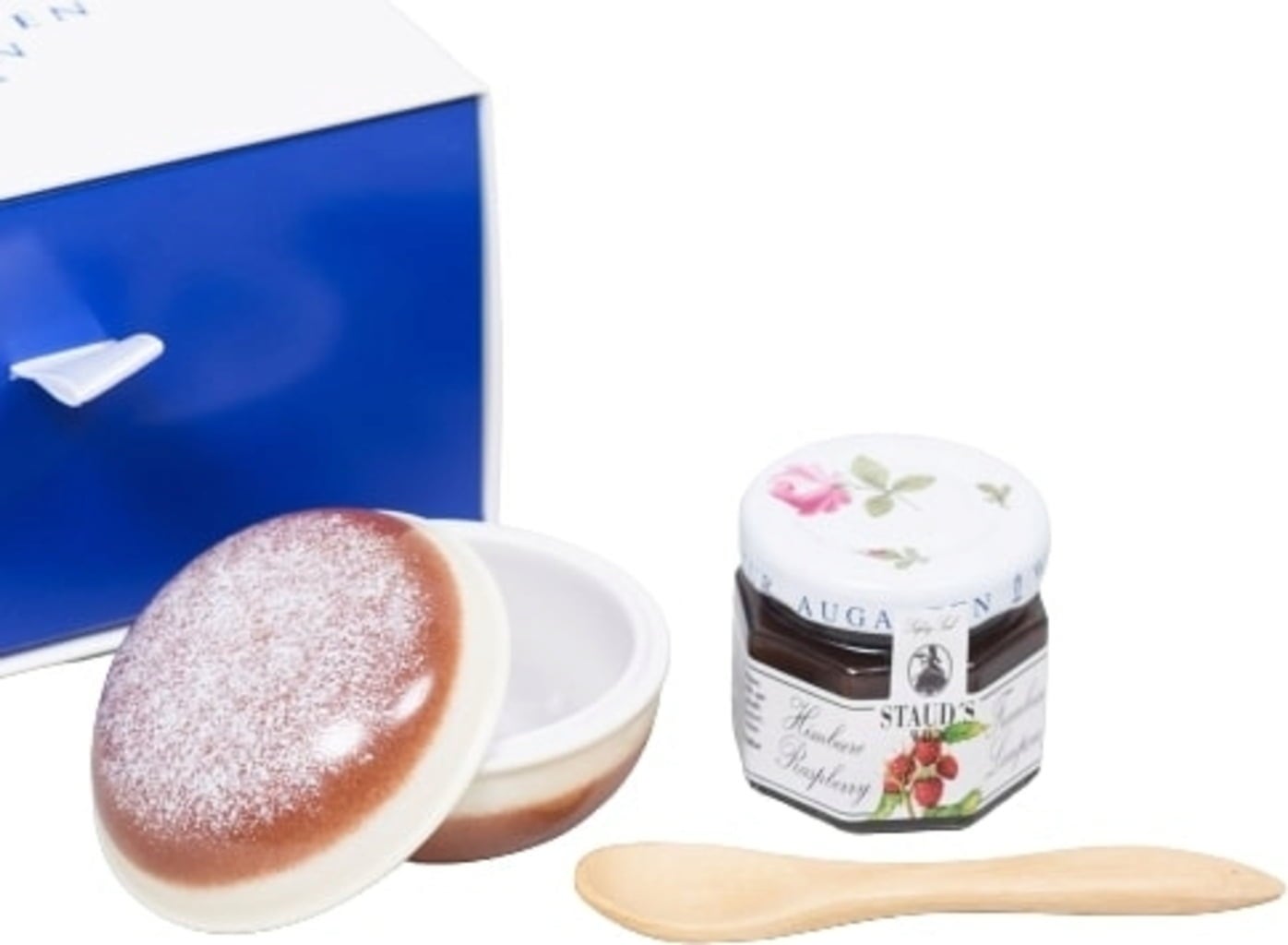 The doughnut tin by Augarten Vienna is made by hand from the finest porcelain. Just like a real doughnut, there is plenty of space in the tin to serve jam in style. That's why the gift set includes a wooden spoon made of bamboo and a small jar of apricot jam.