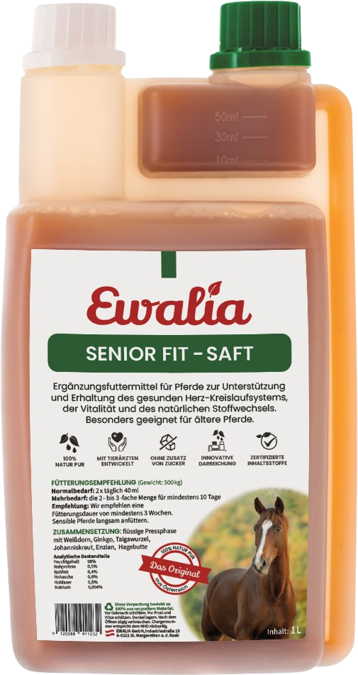 The Senior Fit - Liquid for Horses without added sugar by Ewalia supports healthy body functions, such as the cardiovascular system, the metabolism and the immune system. This feed supplement is made exclusively from plant-based ingredients. It is easy to dose and especially meant for older horses.