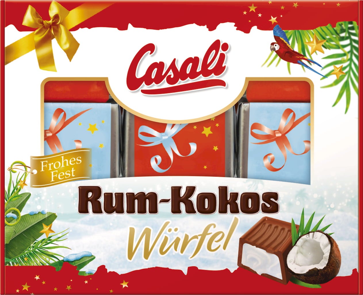 The classic Rum-Coconut confectionery by Casali in a new look: the Winter Rum-Coconut Cubes combines the popular flavours of desiccated coconut and rum in an irresistibly delicate cream filling coated in the finest milk chocolate.