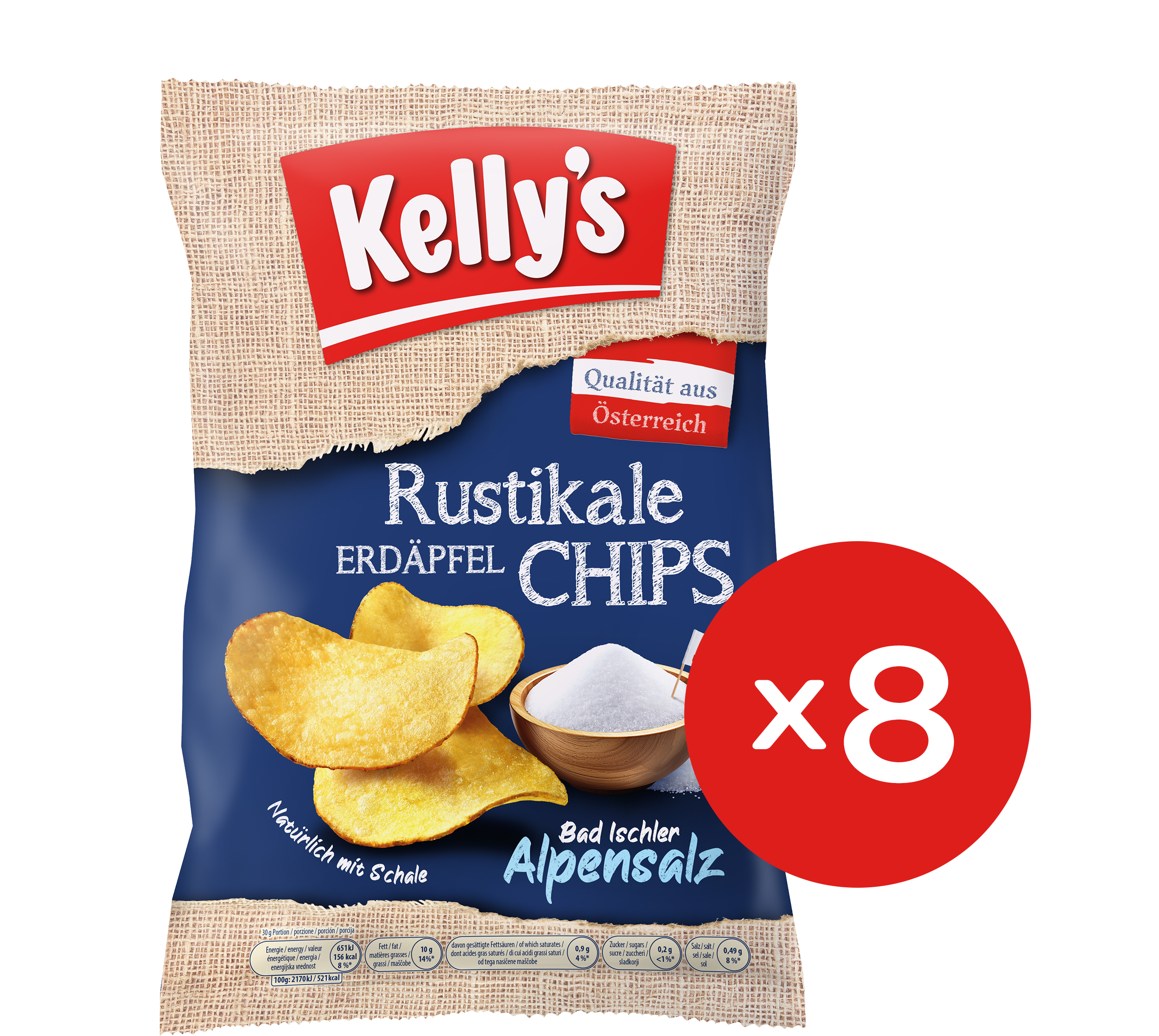 Kelly's Rustic Potato Crisps with Bad Ischl Alpine Salt are made from carefully selected potatoes, processed to create an exceptionally crunchy chip. Seasoned with mild Alpine salt, they offer an intense yet balanced flavour. Whether enjoyed as a classic snack between meals or shared at relaxed parties with friends, these crisps are the perfect snack that everyone reaches for with their natural taste and perfect seasoning.