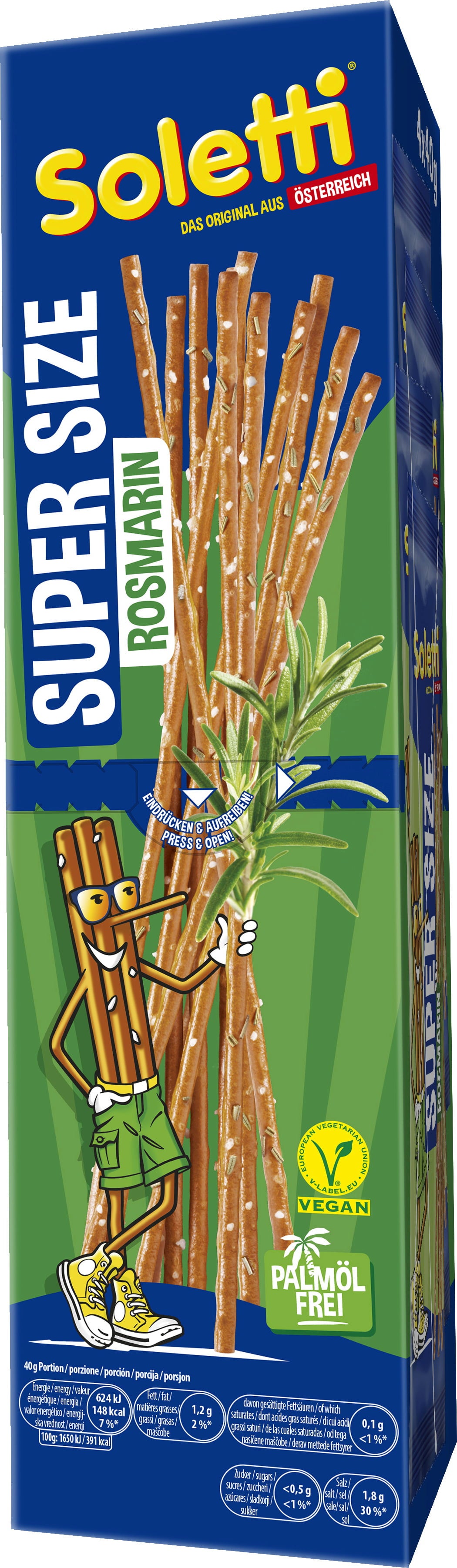The Super Size Pretzel Sticks by Soletti are made in Feldbach, Austria, using Austrian-grown grain and salt from the Alps. The vegan, palm oil-free recipe is rounded out with aromatic rosemary.