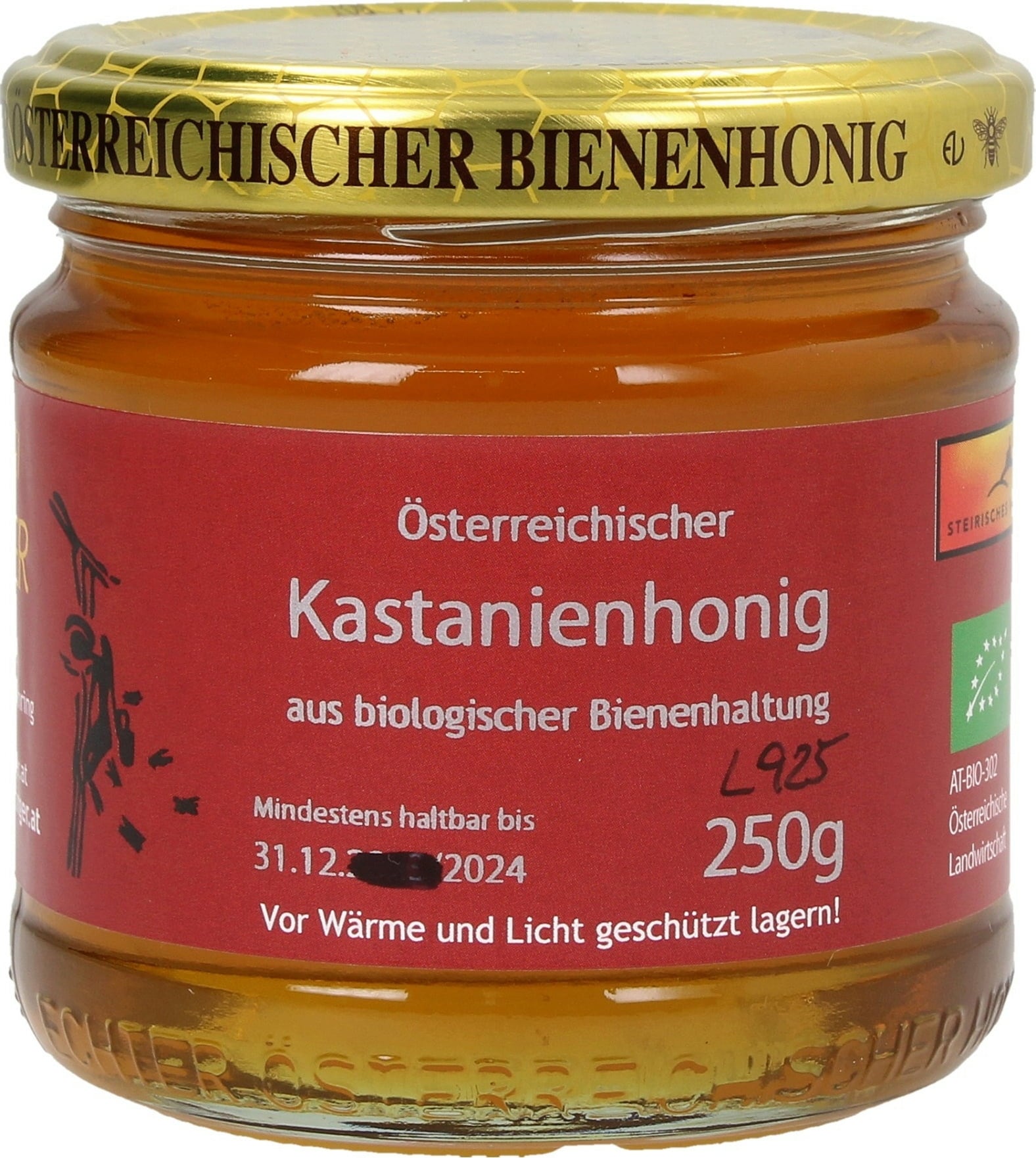 This chestnut honey is a natural blend of nectar and honeydew from the sweet chestnut tree. A typical feature of the honey is its strong, bitter aroma.