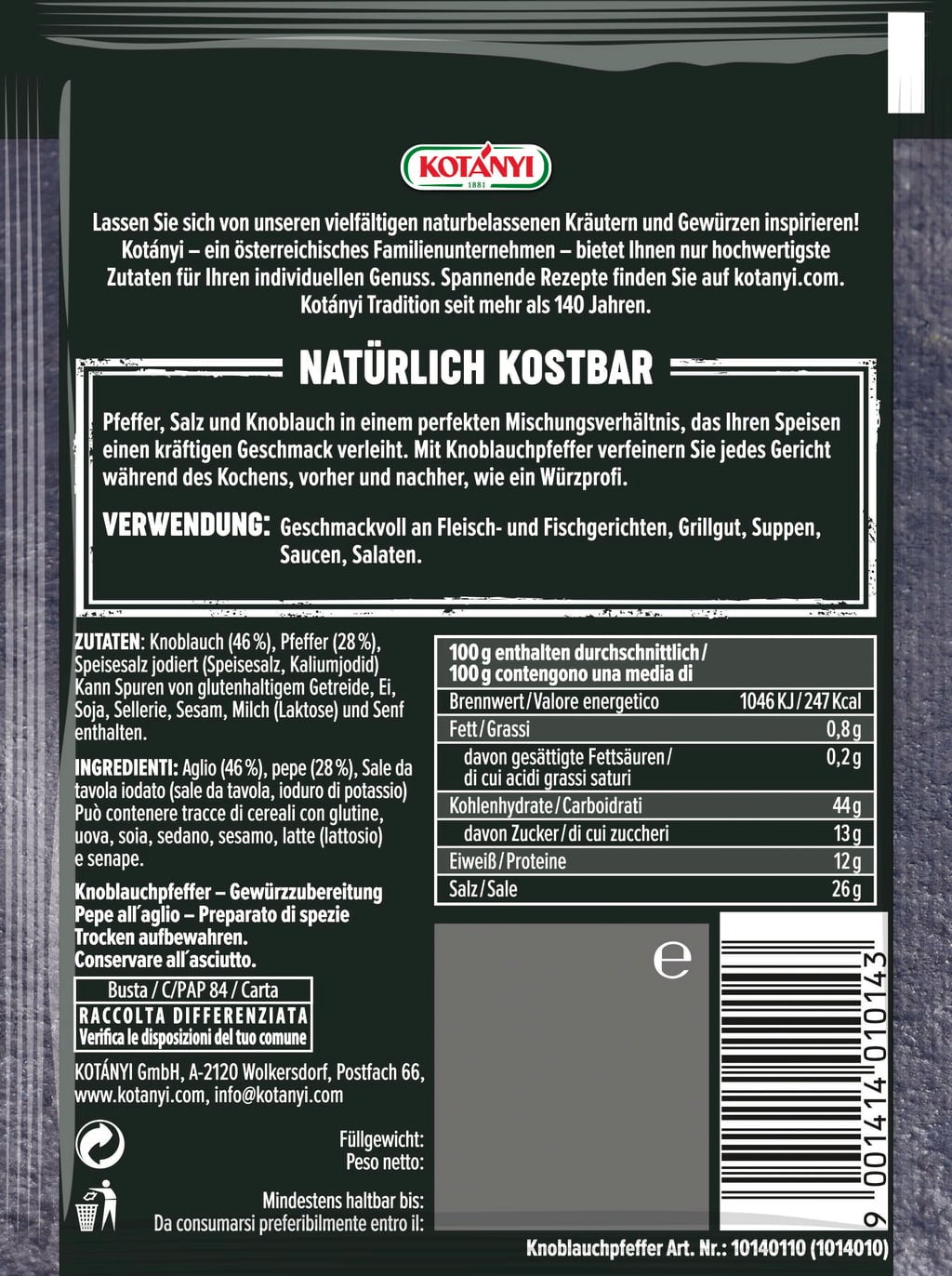 A perfectly balanced blend of pepper, salt and garlic that adds a wonderful flavour to a variety of dishes. KOTÁNYI Garlic Pepper can be used to season dishes before, during and after cooking too.