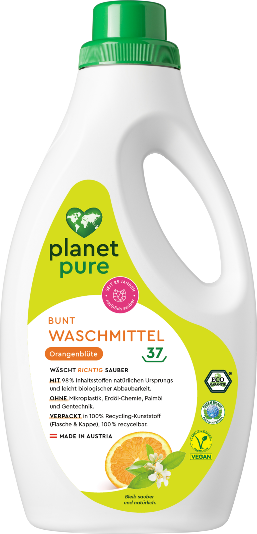 It is formulated with 98.4% natural ingredients and is free from microplastics, palm oil as well as genetic engineering making it rapidly biodegradable. The powerful formula removes dirt at all washing temperatures, ensures hygienic freshness and exudes a wonderful orange blossom scent, which is obtained from natural orange and lemon oil.