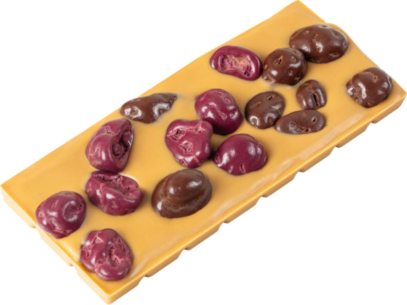 A fabulous interplay of colours, tastes and textures - delicate caramel meets crunchy, colourful nuts! This bar is a masterpiece, combining a luscious caramel couverture with a creamy caramel almond nougat.