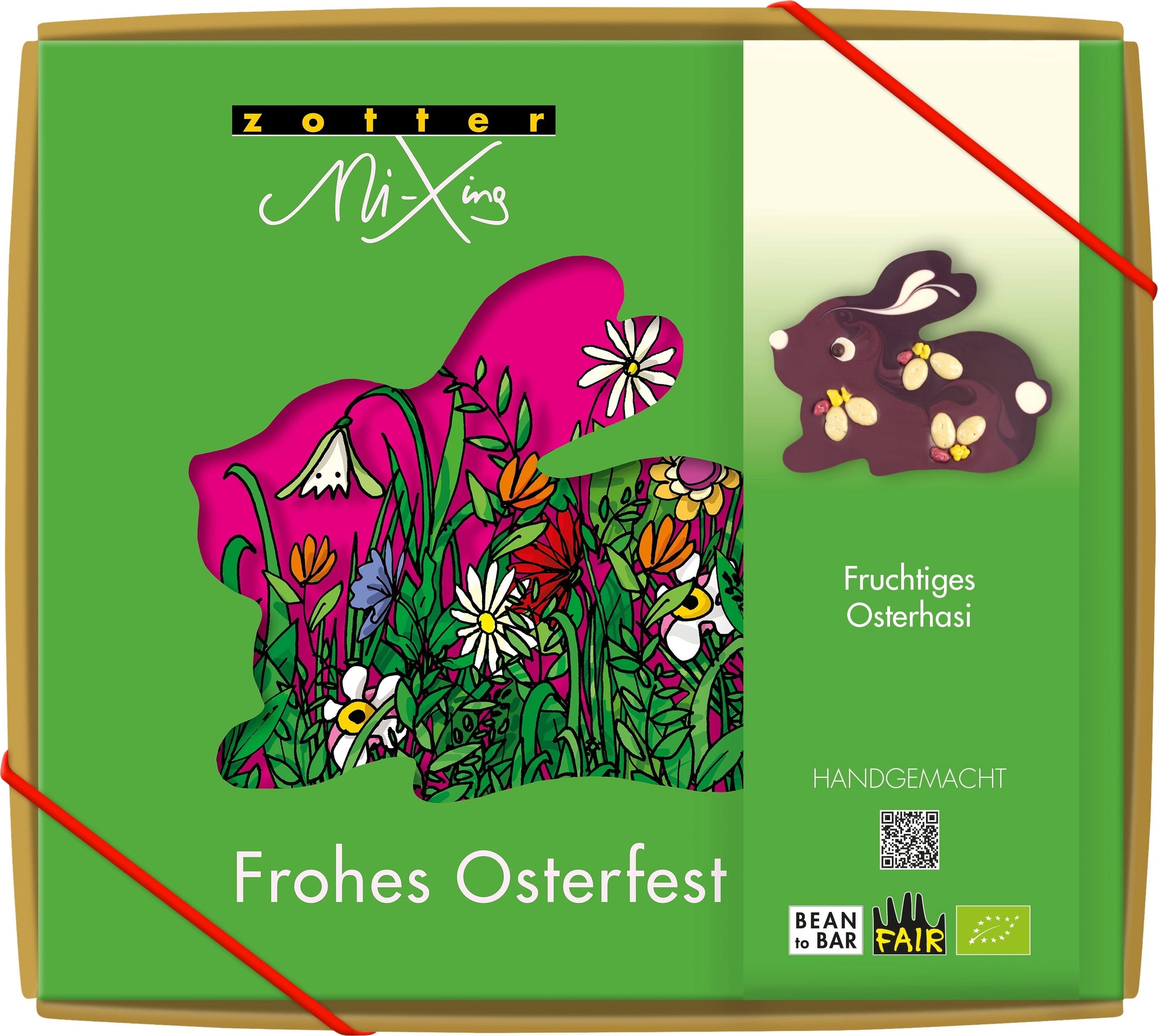 Le lapin de Pâques fruité de Zotter est une figurine en chocolat artistiquement décorée qui associe différentes couvertures aux arômes fruités. Le lapin est composé d’un mélange de couverture à la myrtille et de couverture au cassis, sans colorants artificiels, la couleur étant obtenue exclusivement à partir de véritables baies. Il est décoré avec une couverture coco blanche, de petits yeux en massepain, des morceaux croquants de fruits de la passion enrobés de chocolat, des graines de courge grillées enrobées de chocolat blanc ainsi que des éclats de cacao croquants enrobés de couverture à la framboise.