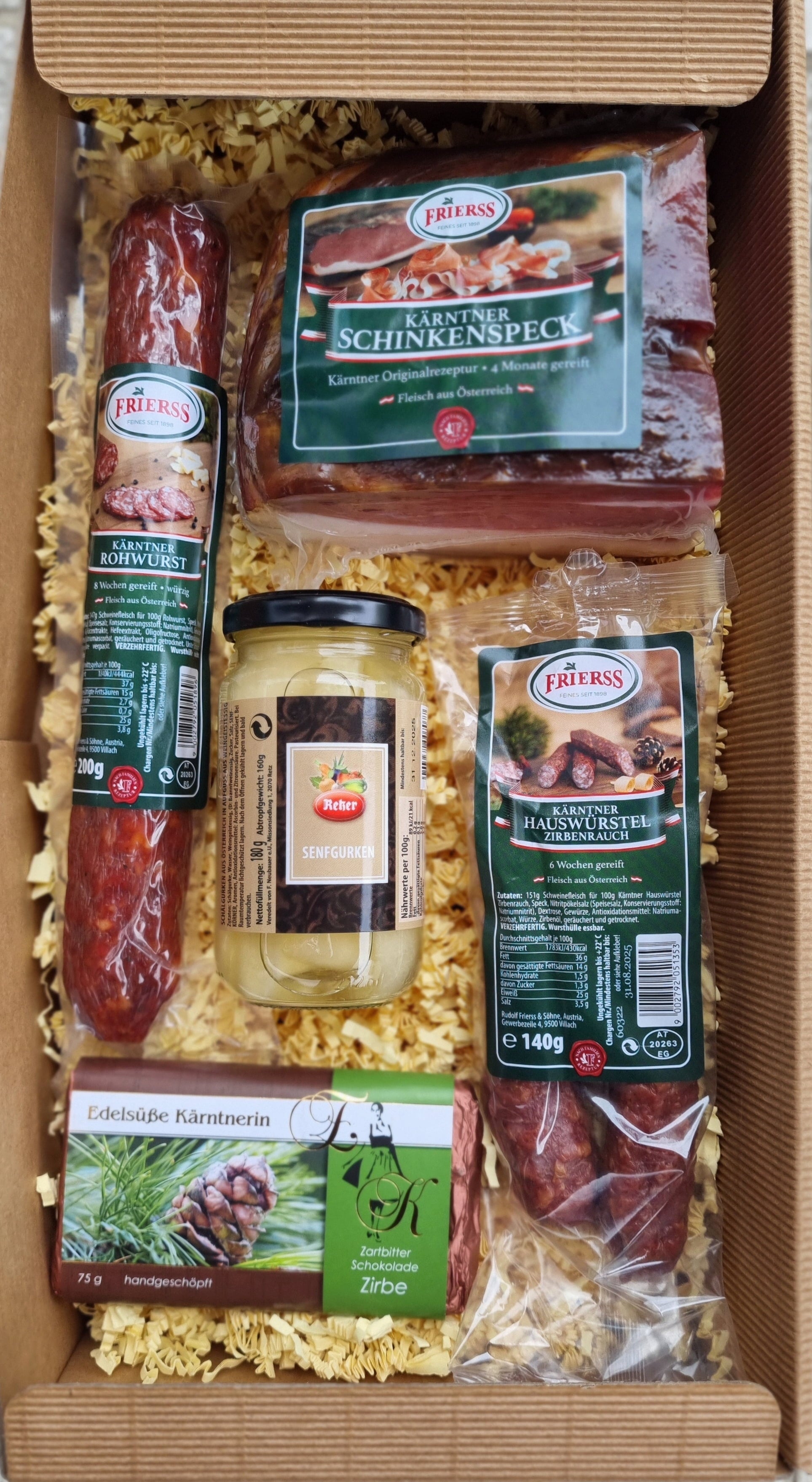Un coffret idéal pour les amateurs de saveurs authentiques. Frierss y a réuni des spécialités régionales de qualité : le célèbre salami de Carinthie, des saucisses séchées savoureuses et de la pancetta. Les cornichons à la moutarde Retzer apportent une touche acidulée parfaitement équilibrée. Pour conclure sur une note sucrée, une tablette de chocolat artisanal signée Nußbaumer. Une sélection généreuse, à offrir ou à s’offrir.