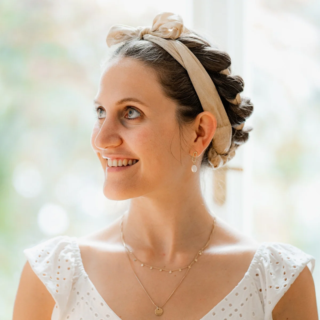 - Puis croisez les deux longueurs de ruban restantes dans la nuque pour les nouer ensuite en un nœud sur le dessus de la tête !