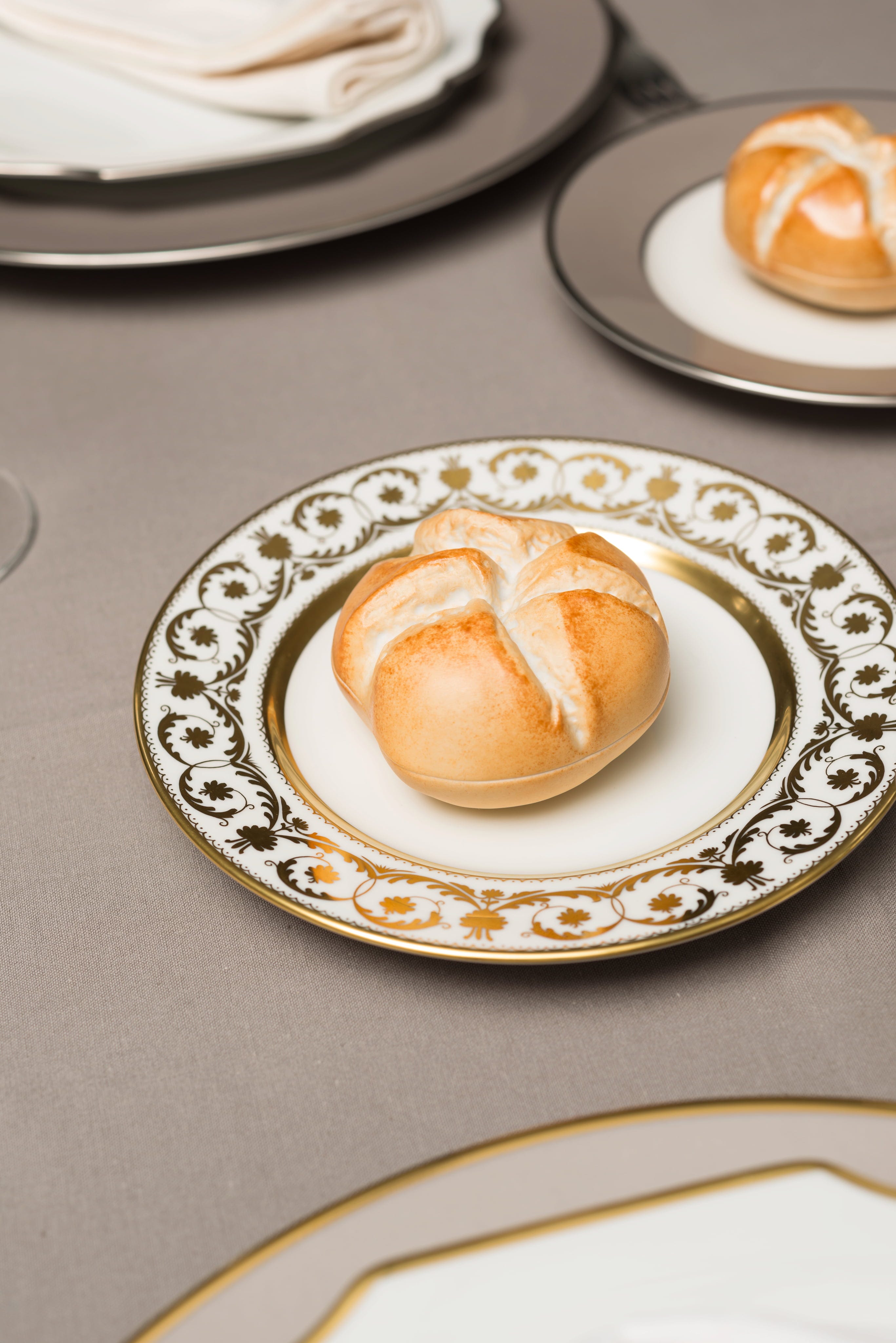 La petite boîte en forme de Kaisersemmel de la manufacture Augarten remet au goût du jour une décoration de table historique. L’empereur François-Joseph Iᵉʳ appréciait lui aussi particulièrement ces petits pains moelleux.