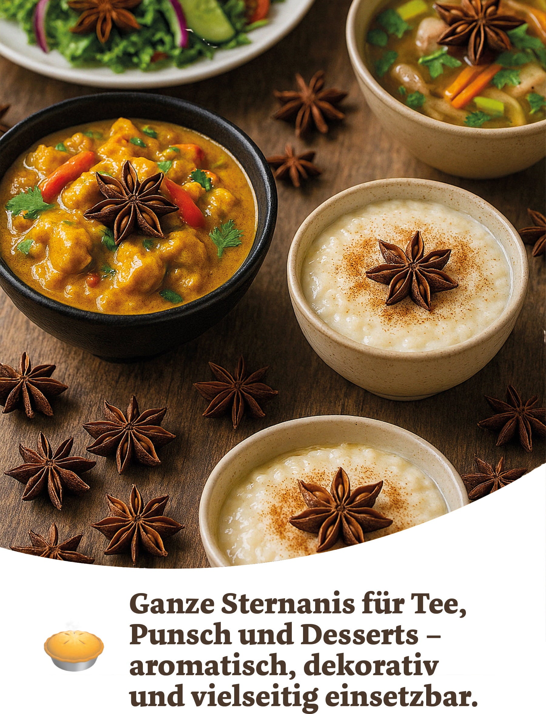 L'anis étoilé est une épice qui convient aussi bien à la préparation de plats salés que sucrés. Il est particulièrement apprécié pendant la période de Noël, non seulement pour son arôme caractéristique, mais aussi pour sa forme étoilée spectaculaire. L'anis étoilé doux et aromatique donne aux aliments et aux boissons une note unique. Il est utilisé notamment pour les plats de viande ou de poisson, les soupes, les sauces, les confitures, les thés, les desserts et les compotes.