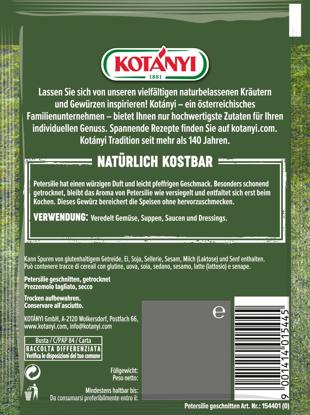 Le persil possède un parfum épicé ainsi qu'un goût rappelant celui du poivre. Ce produit à base de persil séché avec soin, ne répend son goût que lors de la cuisson. Il représente une plus-value pour vos plats.