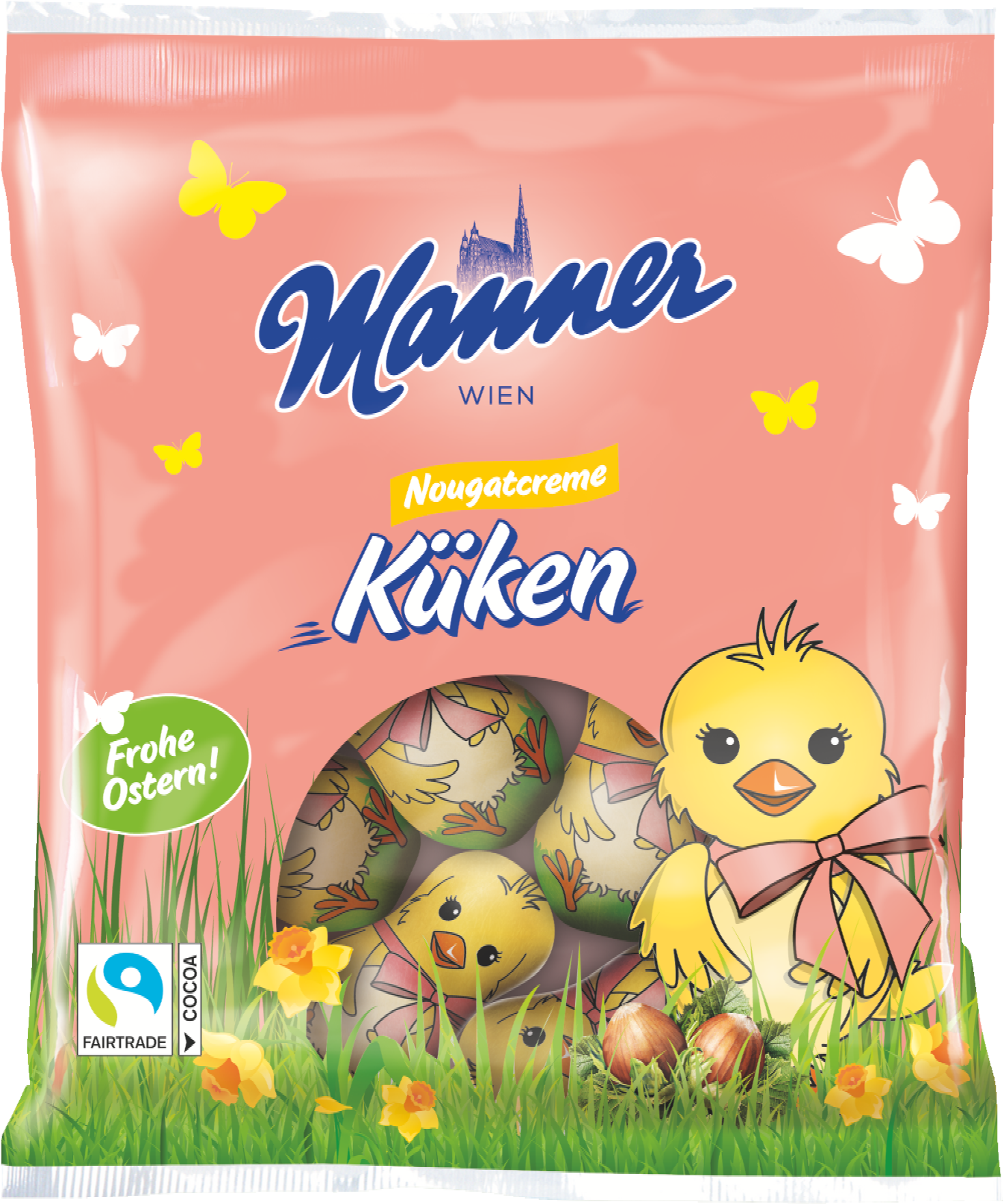 5 adorables poussins en chocolat, fourrés avec une fine crème praliné, qui feront la joie des petits et des grands, pour les prochaines fêtes de Pâques ! Avec du cacao de la propre unité de torréfaction Manner !