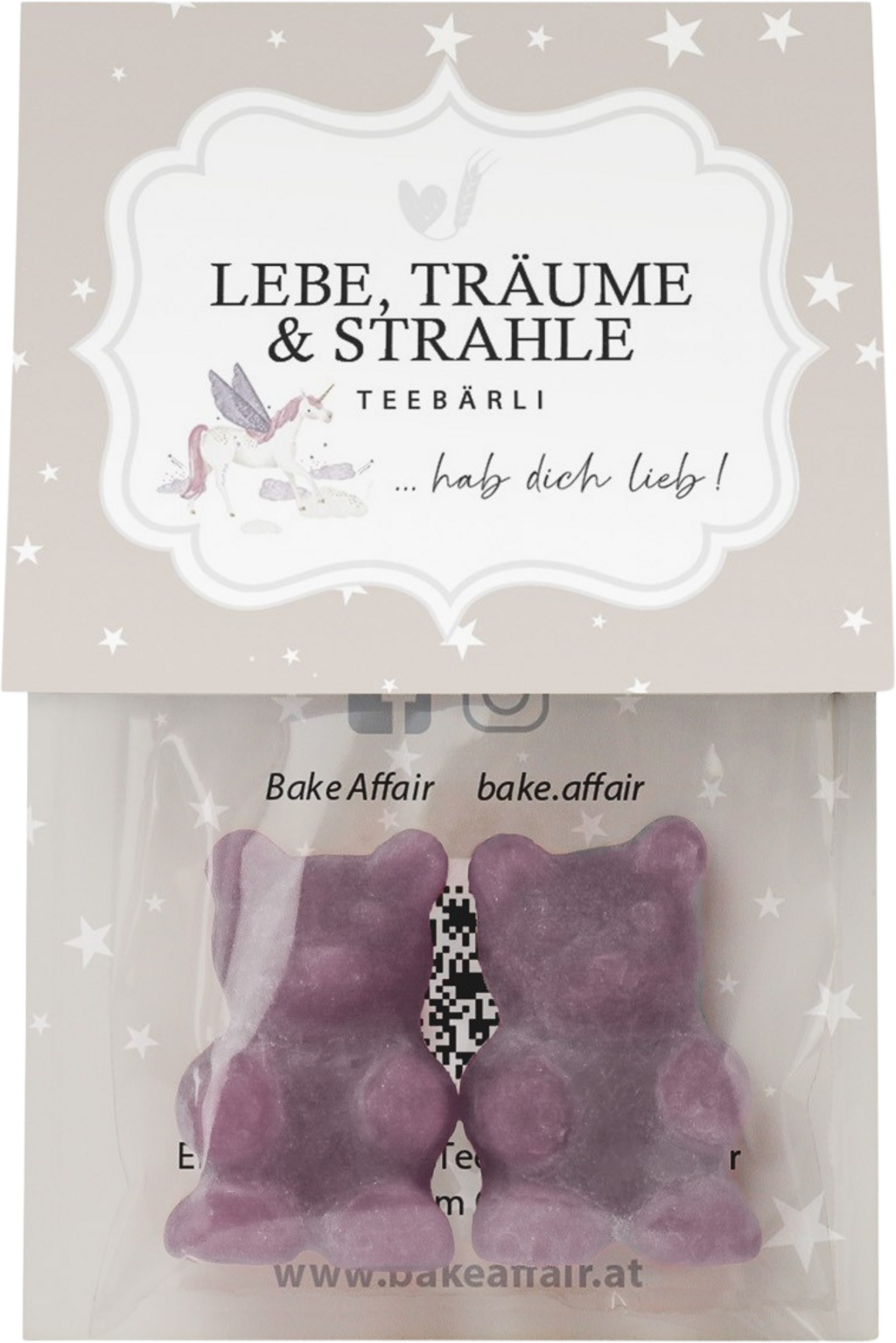 Ezek a különleges Bake Affair teamacik joghurtos és áfonyás ízükkel fiatalok és idősek körében egyaránt népszerűek. Az "Élj, álmodj és ragyogj" ("Lebe, Träume & Strahle") teamacik tökéletesek ajándékként szerettei számára. A csomagoláson a "Hab dich lieb", azaz "Szeretlek" felirat is szerepel.