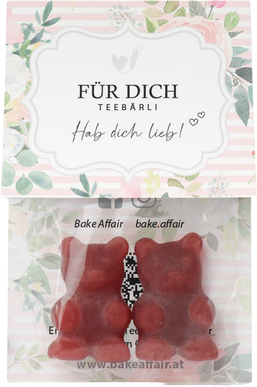 Küldjön kedves üdvözletet a Bake Affair "Neked" ("Für Dich") teamacikkal! A teamaci forró vízben oldódik, így aromás, málna-vanília ízű gyümölcsteát hoz létre. Természetesen a teamaci közvetlenül is fogyasztható. A csomagoláson a "Hab dich lieb!" azaz "Szeretlek!" felirat is szerepel.