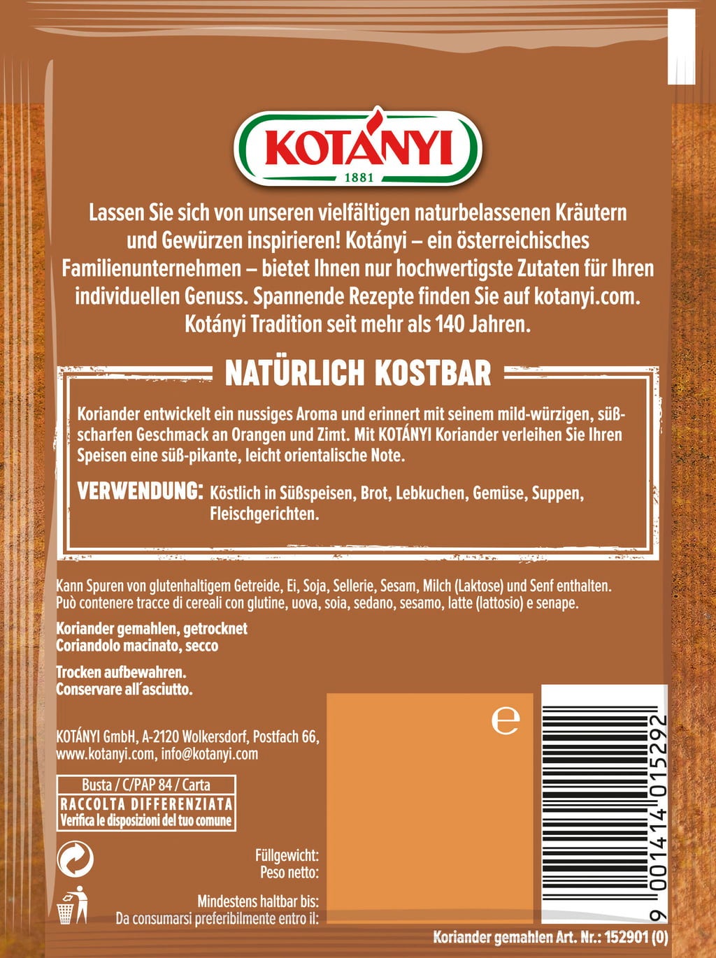 Az őrölt koriander diós aromájú, enyhén fűszeres, édes-csípős íze a narancsra és a fahéjra emlékeztet. A KOTÁNYI Koriander enyhén édes-pikáns, kissé keleties jegyeket biztosít az ételeknek.