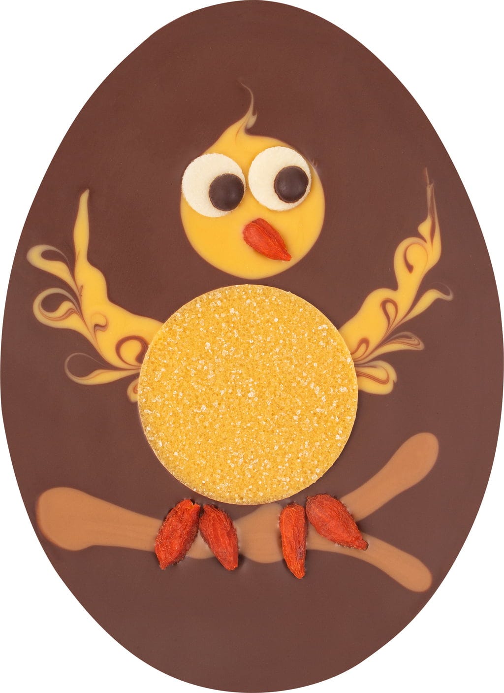Ugye, milyen aranyos ez? Ez az 50%-os kakaótartalmú tejcsokoládé tojás egy aranyos, sárgabarack couverture-ból készült csibét és egy csillogó sárgabarackszeletetből készült testet tartalmaz. Szemei marcipánból, csőre és lábai goji bogyóból, az ág pedig mandulás nugátcsokoládéból készült.