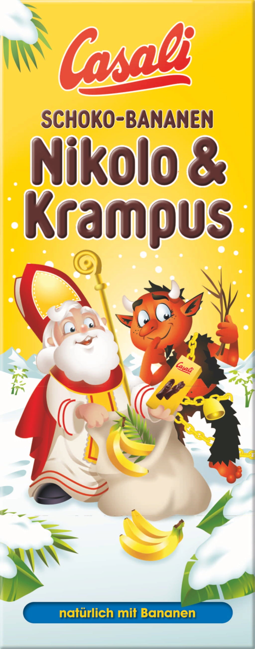 Purea di banana succosa e fruttata sotto una sottile copertura di cioccolato croccante. Queste sono le famose Schoko-Bananen di Casali, uno dei dolci più popolari in Austria. In questa versione, i popolari dolcetti fruttati si presentano nella veste di San Nicolò e del Krampus, due figure che vengono festeggiate a inizio dicembre e che sono una tradizione delle feste dei Paesi di tradizione germanica.