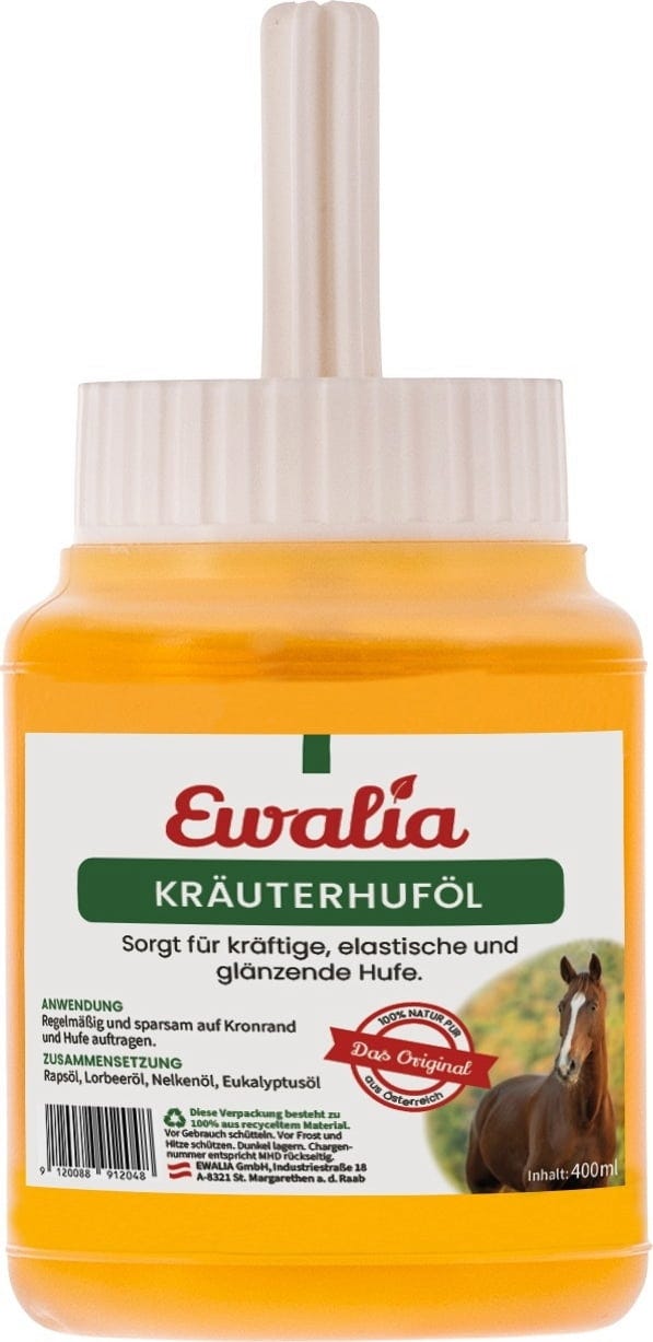 Questo olio a base di erbe per gli zoccoli di Ewalia garantisce zoccoli forti, sani e belli. Va applicato regolarmente e con parsimonia sulla corona e sugli zoccoli.