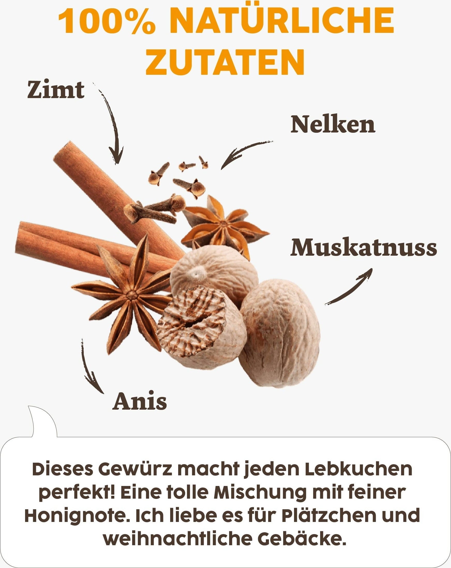 cannella, noce moscata, coriandolo, zenzero, finocchio, chiodi di garofano, pimento (pepe garofanato), anice, anice stellato, pepe, semi di cardamomo