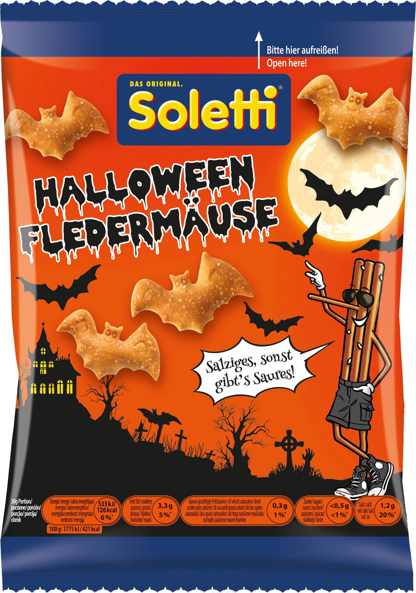 Dolcetto o scherzetto? La festa più spaventosa dell'anno ha ispirato questi simpaticissimi snack Soletti a forma di pipistrello. Non sono solo bellissimi da vedere, ma anche buonissimi e super croccanti. Uno snack mostruosamente gustoso e divertente per tutta la famiglia che non potrà mancare in occasione del prossimo Halloween!
