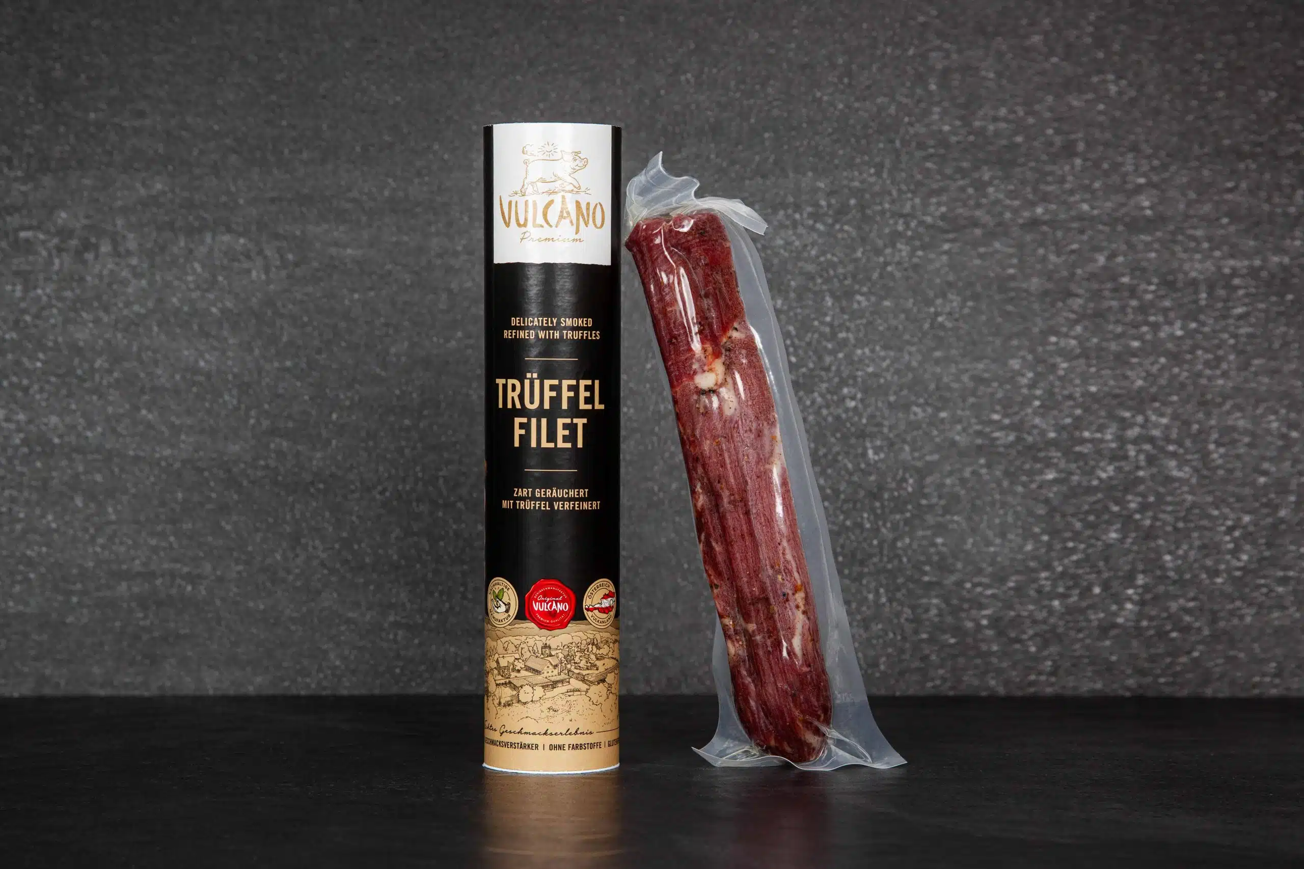 Consiglio di Vulcano: per un aperitivo rustico, prova il filetto al tartufo tagliato a mano e servito su fette di pane nero. Per una variante in stile mediterraneo: filetto al tartufo affettato sottilmente e servito con fette di baguette o ciabatta tostate o ripassate in padella con olio d'oliva, rosmarino e un pizzico di sale. Perfetto in accompagnamento con formaggi stagionati come parmigiano, pecorino, toma o emmentaler.