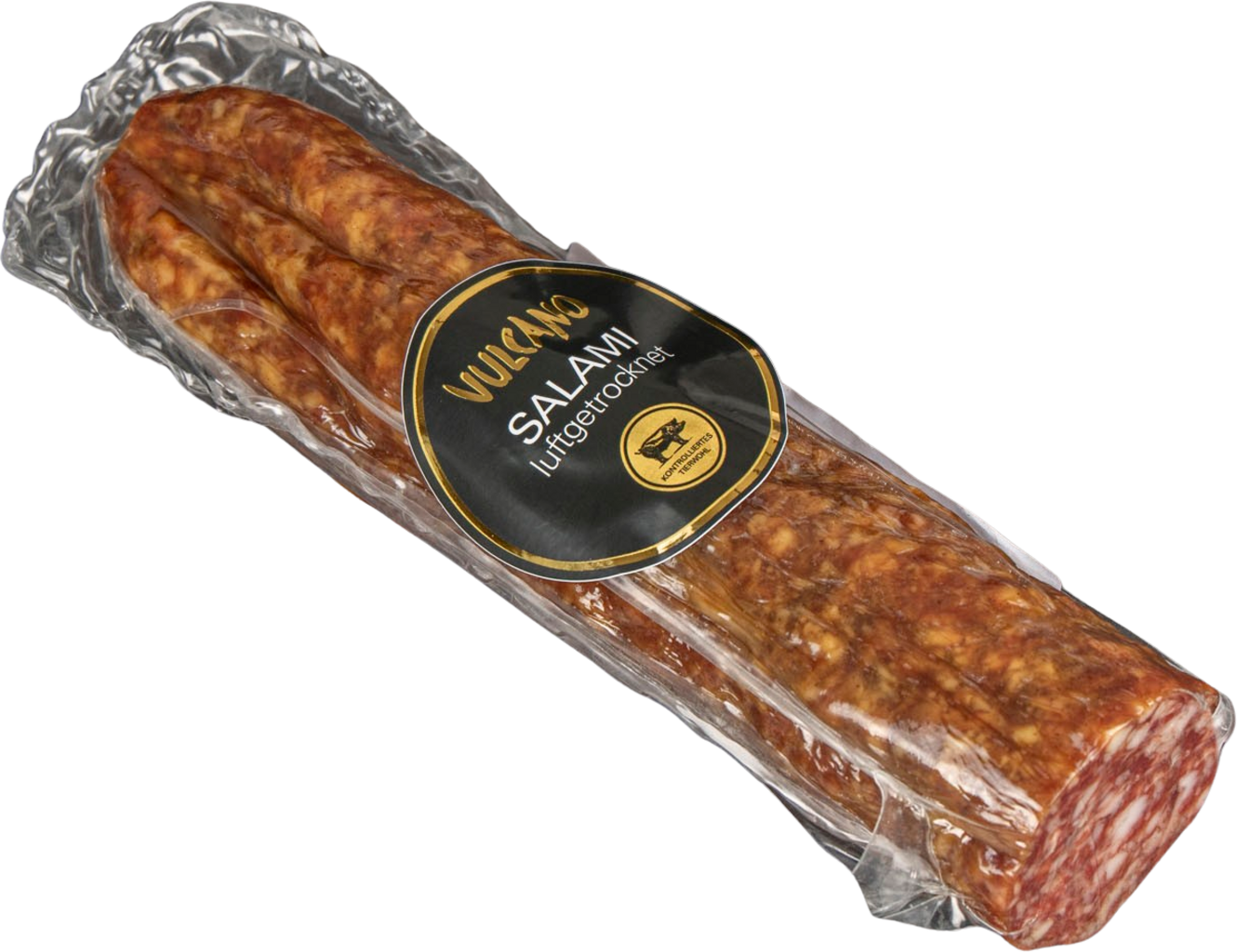 Il salame Exklusiv di Vulcano si distingue per la perfetta combinazione di carni selezionate, lentamente stagionate all’aria fino a raggiungere un gusto pieno e armonioso. Ideale per taglieri di salumi, raclette o come sfizioso snack dal sapore intenso. Senza glutine e senza lattosio, è un piacere adatto a tutti.