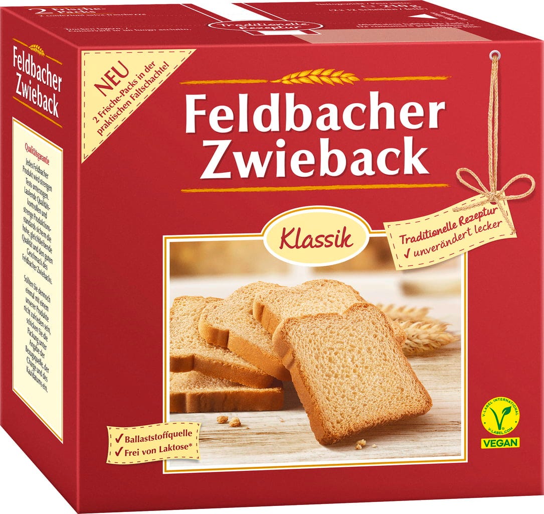 Le fette biscottate Classic di Feldbacher si distinguono per la loro croccantezza e i loro sapore delicato. Sono ideali per la colazione o anche per uno spuntino e si possono utilizzare anche per creare altre fantasiose ricette dolci e salate.