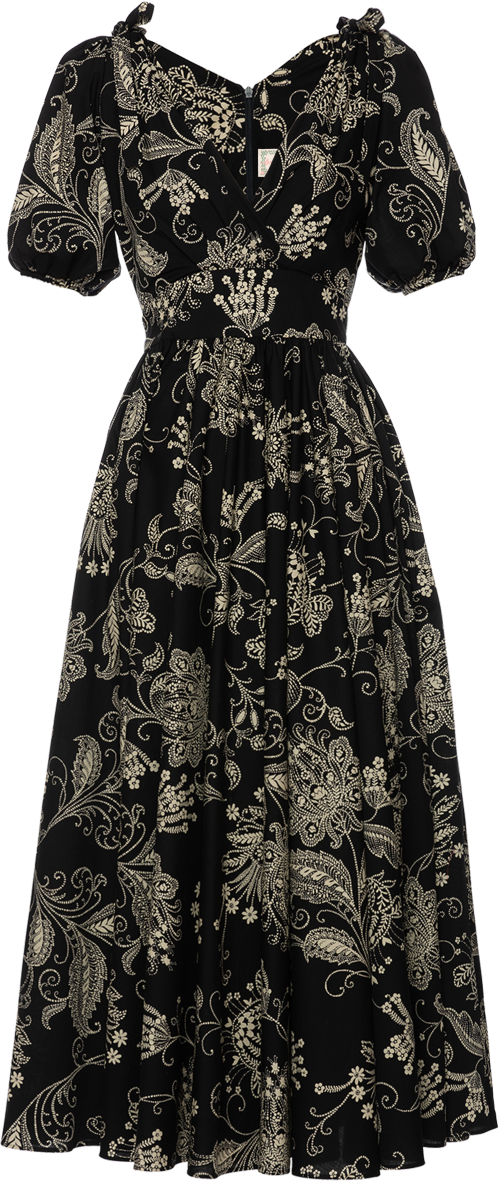 Questo vestito di Lena Hoschek è perfetto per chi cerca eleganza e stile. È realizzato in un tessuto morbido e fluido e scende dolcemente sul corpo. Ha le maniche corte e un profondo scollo a V.