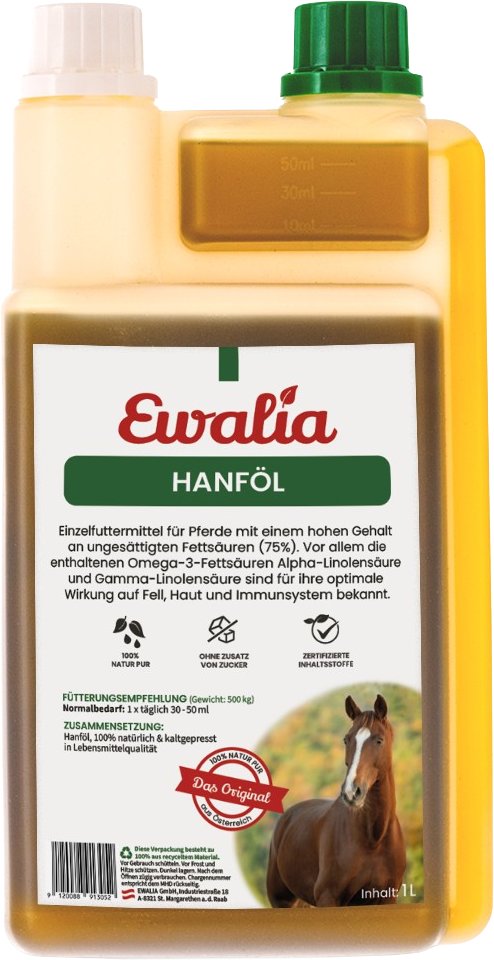 Ewalia's HENNEPOLIE met de omega-3 vetzuren alfa-linoleenzuur en gamma-linolzuur staat bekend om zijn optimale werking op vacht, huid en immuunsysteem. De hennepolie is 100% puur natuurlijk en koudgeperst in voedselkwaliteit. De olie bevat geen noemenswaardige hoeveelheden THC en biedt een breed scala aan toepassingen en bevat essentiële aminozuren, vitamines, antioxidanten, mineralen, enzymen en fytochemicaliën. Het heeft een hoog gehalte aan meervoudig onverzadigde vetzuren (75%) en geen toevoegingen!
