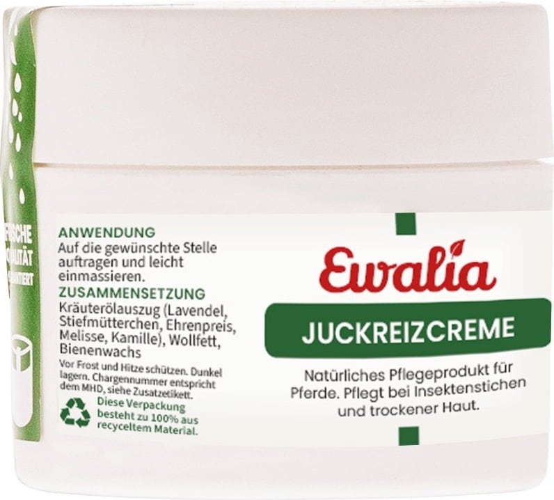De ITUCKREIZ CREME van Ewalia verzorgt paarden tegen insectenbeten en een droge huid, en is ideaal voor gerichte afweermiddelen tegen muggen en insecten. De crème bevat waardevolle kruidenoliën voor de verzorging en regeneratie van de huid!