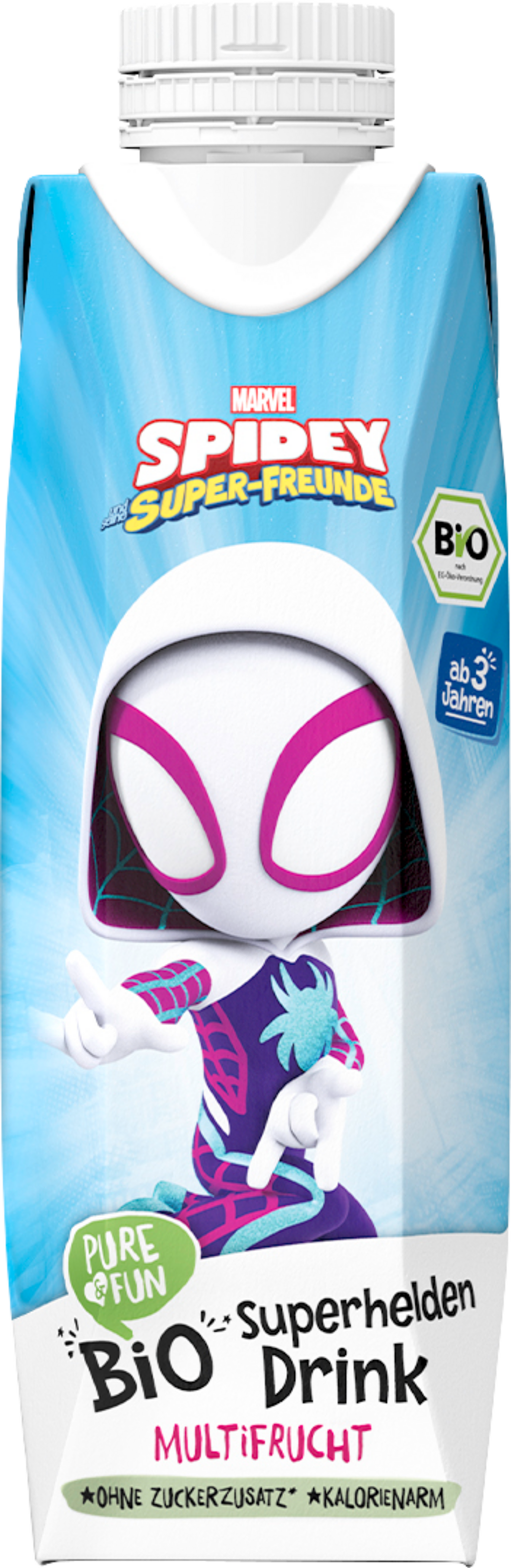 Zelfs superhelden krijgen dorst! Gelukkig hebben ze onze fruitige en heerlijke superheldendrank bij zich. Met een mix van appel, druif, ananas, citroen, perzik, mango, grapefruit en banaan begint elke superheldenmissie met een verfrissende, spin-tastische start! 100% biologisch, laag in calorieën, geen toegevoegde suiker* - perfect voor elke superheldenmissie!