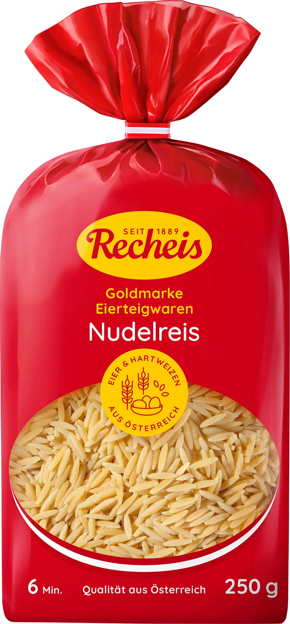 De rijstpasta uit de Goldmarke lijn van Recheis is een bijzonder kleine pastavorm die lijkt op rijstkorrels. Het is geweldig voor peuters en om toe te voegen aan soepen of pastasalades. Gemaakt met 100% Oostenrijkse ingrediënten zoals griesmeel van durumtarwe en eieren. Dankzij de eieren blijft de pasta na het koken lekker stevig aan de bite.