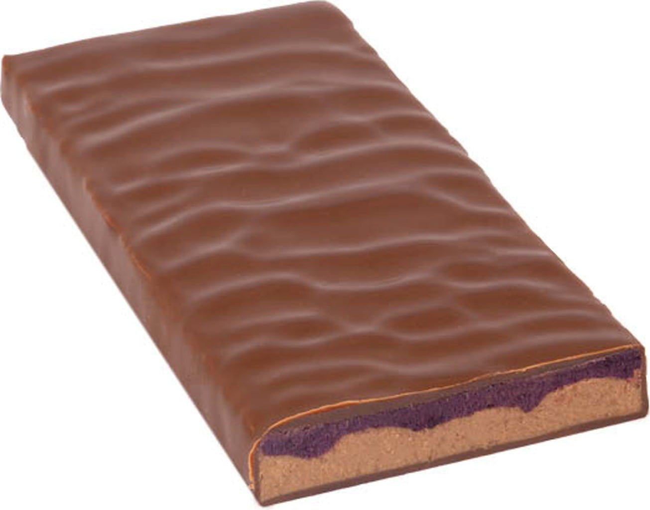 Deze gevulde reep, omhuld door fijne donkere melkchocolade met 50% cacaogehalte, viert de aromatische Amelanchier. Deze bijzondere vrucht is geen klassieke peer, maar doet qua smaak en uiterlijk denken aan bosbessen – met een vleugje marsepein. Dat unieke aroma gebruikt de chocolademaker Zotter voor een intens fruitige Amelanchierganache, verfijnd met witte chocolade en een scheutje citroen.