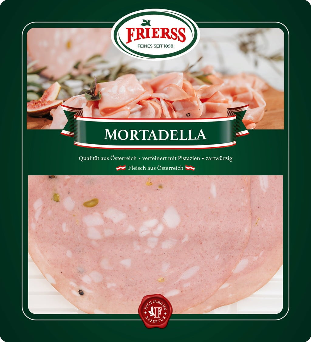 De door de familie FRIERSS gesneden mortadella wordt al tientallen jaren ambachtelijk gemaakt en gebakken in het zuiden van Oostenrijk, vlakbij Italië, volgens een origineel recept. De specialiteit voor fijnproevers is gemaakt van 100% lokaal varkensvlees. De sappige bite smaakt naar opa's passie, aangenaam en fris. De mortadella heeft meerdere gouden medailles ontvangen en is gesneden voor een eersteklas, uitgebalanceerde, delicate, pittige smaak!