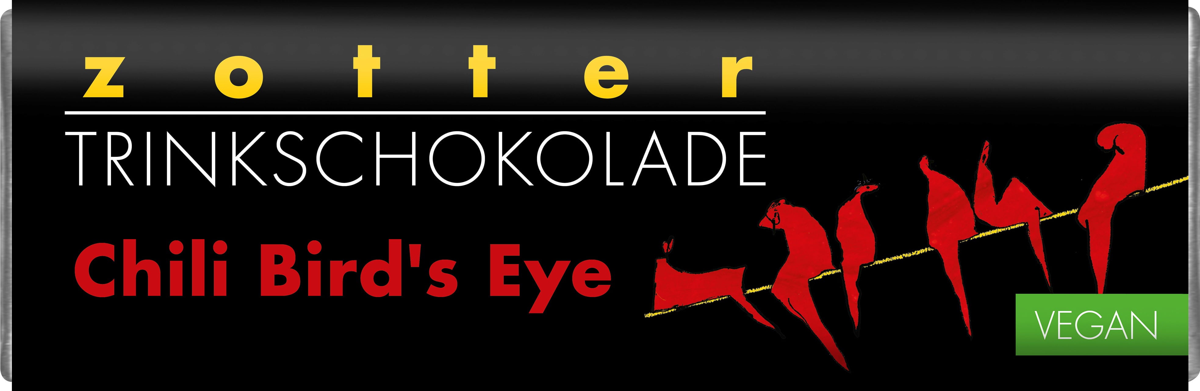 De drinkchocolade "Chili" Bird's Eye" van Zotter Schokoladen is een chocolade met een hoog percentage die de zintuigen prikkelt. Er zit namelijk veel chili in, wat de drinkchocolade tot een warme drank maakt. Chili "Bird's Eye" wordt beschouwd als de oorspronkelijke vorm van chili en is zeldzaam, vurig en vol van smaken. Deze pure drinkchocolade met een hoog percentage wordt in eigen huis van de boon gemaakt en in een reep gegoten!