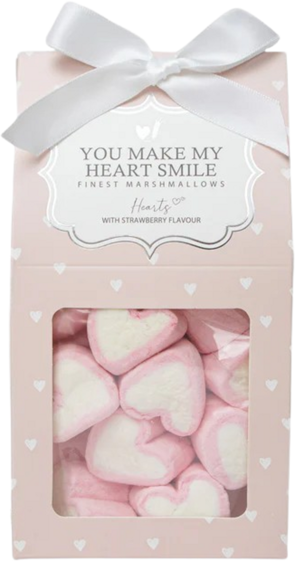 Różowe serduszka marshmallow "You make my heart smile" o smaku truskawkowym od Bake Affair są idealne jako słodkie pozdrowienia w kształcie serca. Idealne jako miłosny prezent, przekąska między posiłkami lub dodatek do czekolady do picia, ciast itp.