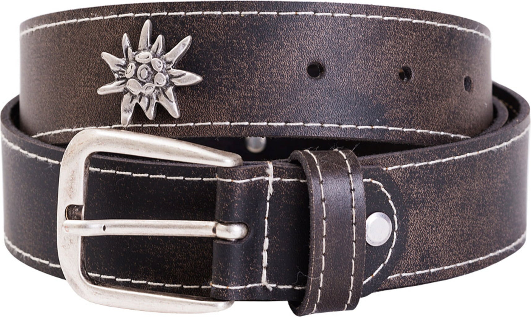 Ten tradycyjny pasek jest ozdobiony szarotką w kolorze cynku i prezentuje gustowny alpejski styl. Skóra bydlęca zachwyca ręcznie przecieranym dwukolorowym wyglądem w różnych odcieniach brązu. Pasek ma antyczną srebrną klamrę, kremowe ozdobne szwy i bardzo dobrze pasuje do skórzanych spodni i dżinsów.