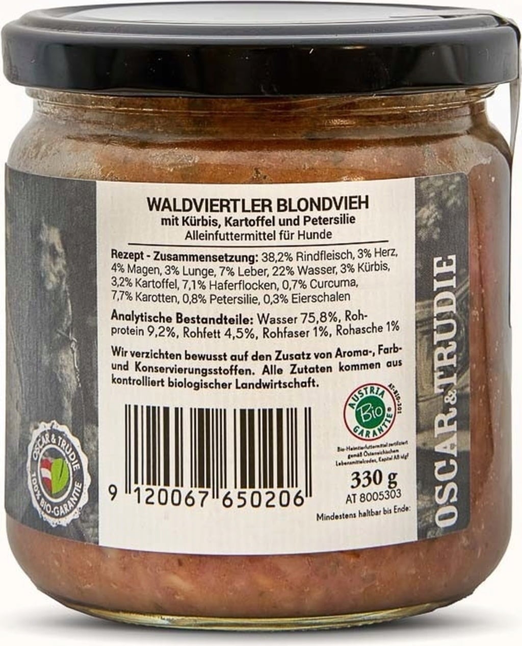 Wysokiej jakości składniki, takie jak wołowina, dynia, ziemniaki i pietruszka, są przetwarzane wyłącznie zgodnie z surowymi wytycznymi ekologicznymi. Do tego dochodzi mięso mięśniowe, serce, wątroba, płuca i żołądek, które zapewniają wyjątkowe doznania smakowe i rozpieszczają wszystkie zwierzęta! Do karmy nie są dodawane żadne aromaty, barwniki ani konserwanty!