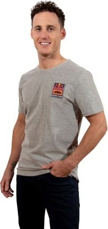 Szara koszulka Red Bull KTM Racing Team z naszywką i okrągłym dekoltem jest prosta, pomimo logo na lewej piersi. Obszycie Red Bull KTM znajduje się po wewnętrznej stronie kołnierza i wraz z wielokolorowym logo wspierasz dyskretnie swój ulubiony zespół!